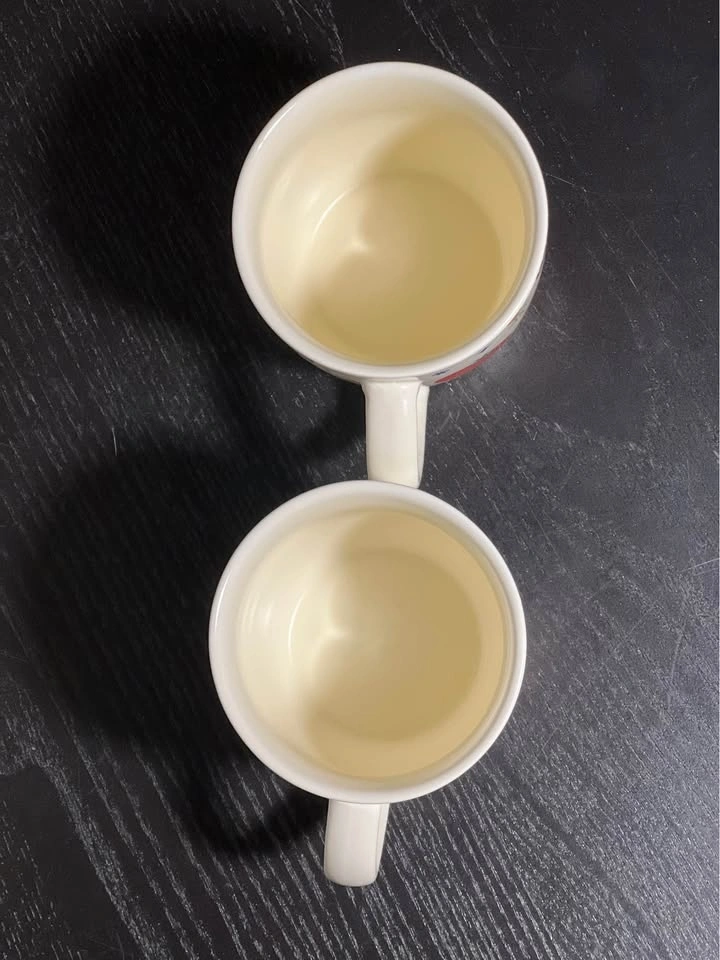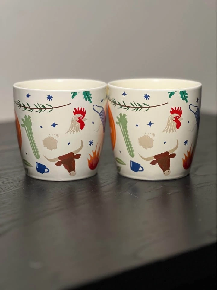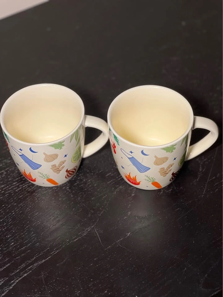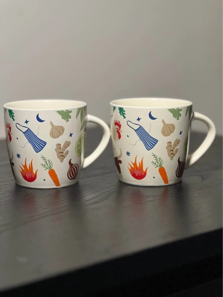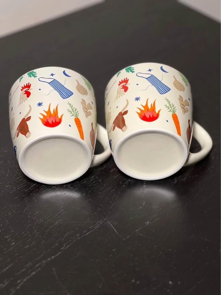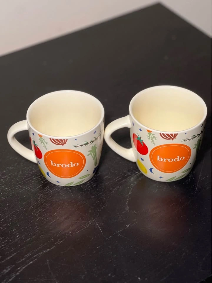 These are Brodo soup mugs from the NYC-based eatery Brodo, known for its bone broth. The ceramic mugs feature a colorful veggie and spice print that includes images of tomatoes, lemons, garlic, and herbs.