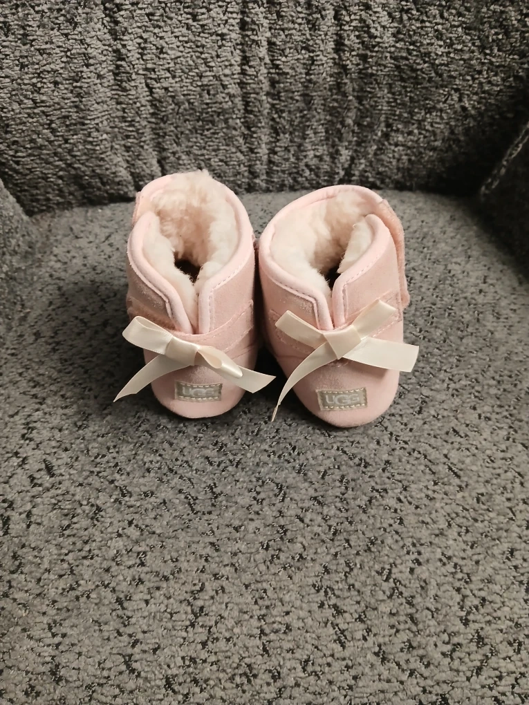 These adorable UGG baby booties are in excellent condition! They're a soft pink colour and feature a cute ribbon detail. perfect for keeping little feet warm and cozy. Size 2/3