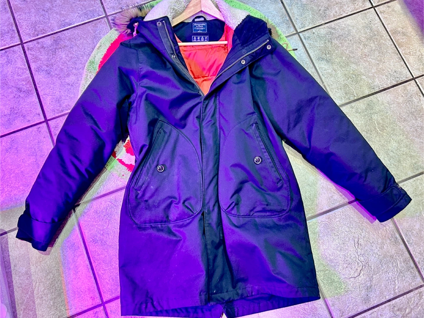Lovely, warm Abercrombie and Fitch winter coat. No signs of wear and in almost new condition. It has a two way zipper and button snaps. The hood is lined and has fur around it. It’s actually dark grey/black. It was taken beside a grow light. 😀