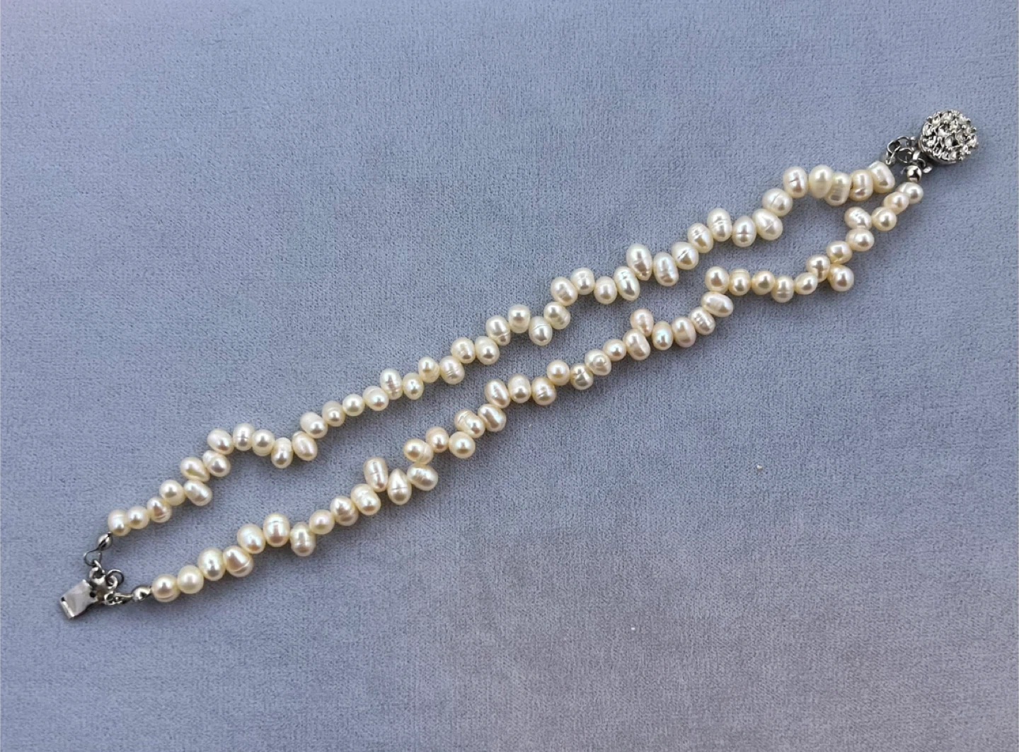 The pearls exhibit slight variations in size and shape, adding to its unique charm and character