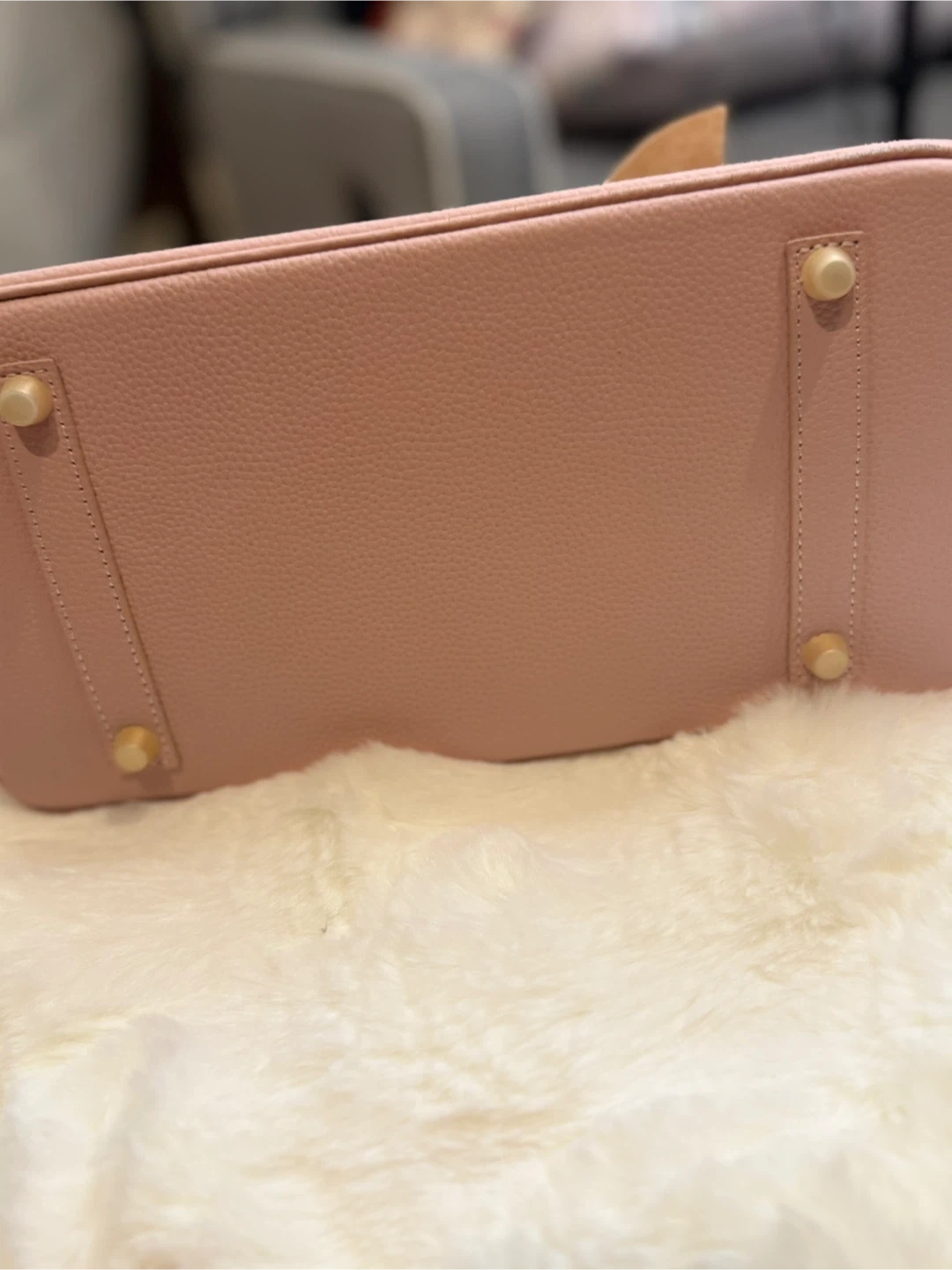 Selling a beautiful pink leather handbag! It comes with a lock and a shoulder strap, all still in their original packaging. The bag has a lovely texture and a classic design. Perfect for adding a touch of elegance to any outfit!