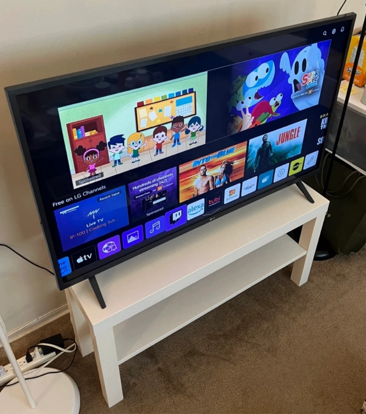 Modern white wooden IKEA Lack TV stand (TV bench). Solid and sturdy. Perfect for up to 43” TV (The smart TV shown in the pictures is 43”). It can also be used as a console table or shoe rack. It's in excellent condition, like new. From smoke-free, pest-free, and pet-free home.