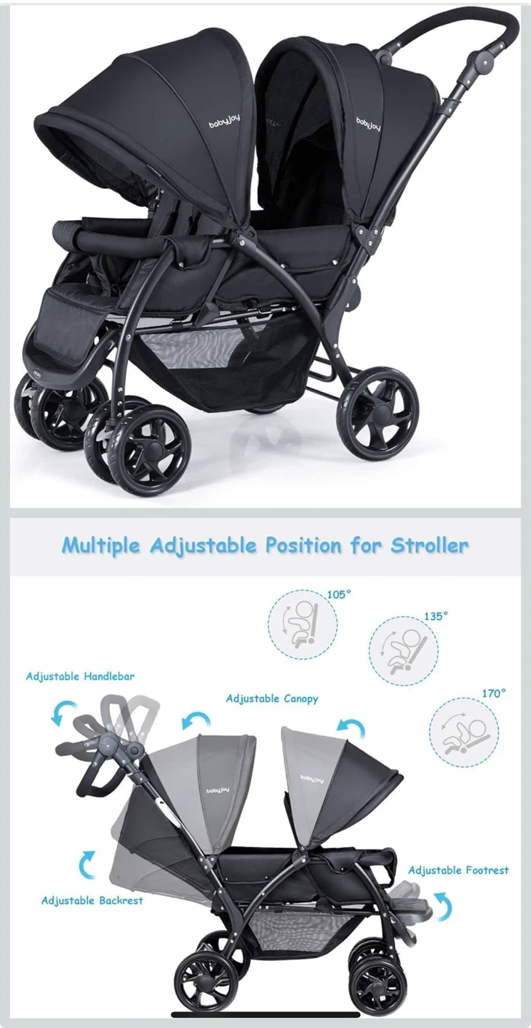 Selling a babyjoy double stroller in black! It features multiple adjustable positions for the stroller, including the handlebar, canopy, backrest, and footrest. It also has a 5-point safety harness and a big storage basket. The dimensions are approximately 37.5"-43" in height, 48" in length, and 22.5" in width.