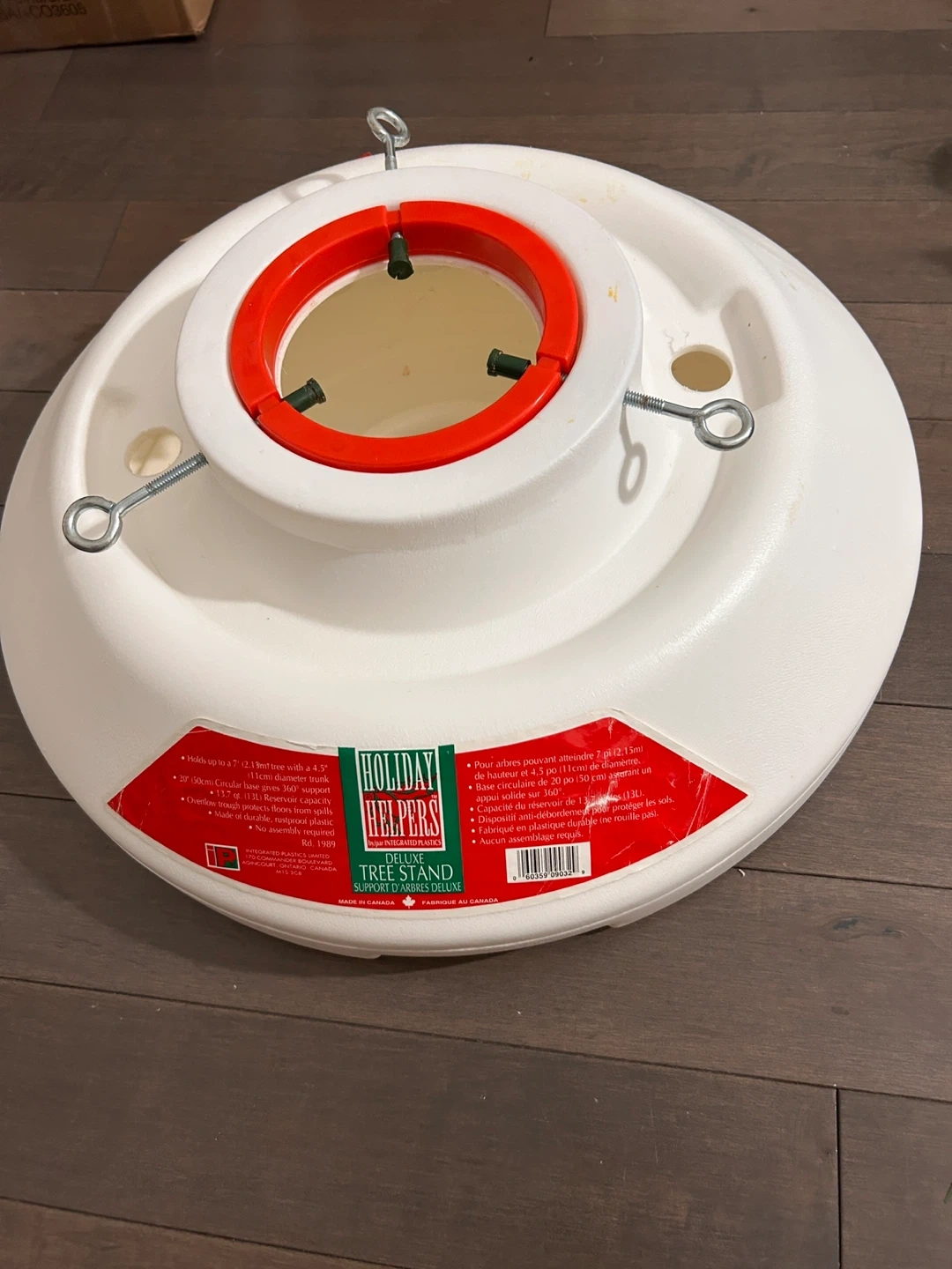 Selling a Holiday Helpers Deluxe Tree Stand! It holds up to a 7' (2.13m) tree with a 4.5" (11cm) diameter trunk. The circular base is 20" (50cm) giving 360° support. It also has a 13.7 qt. (13L) reservoir capacity