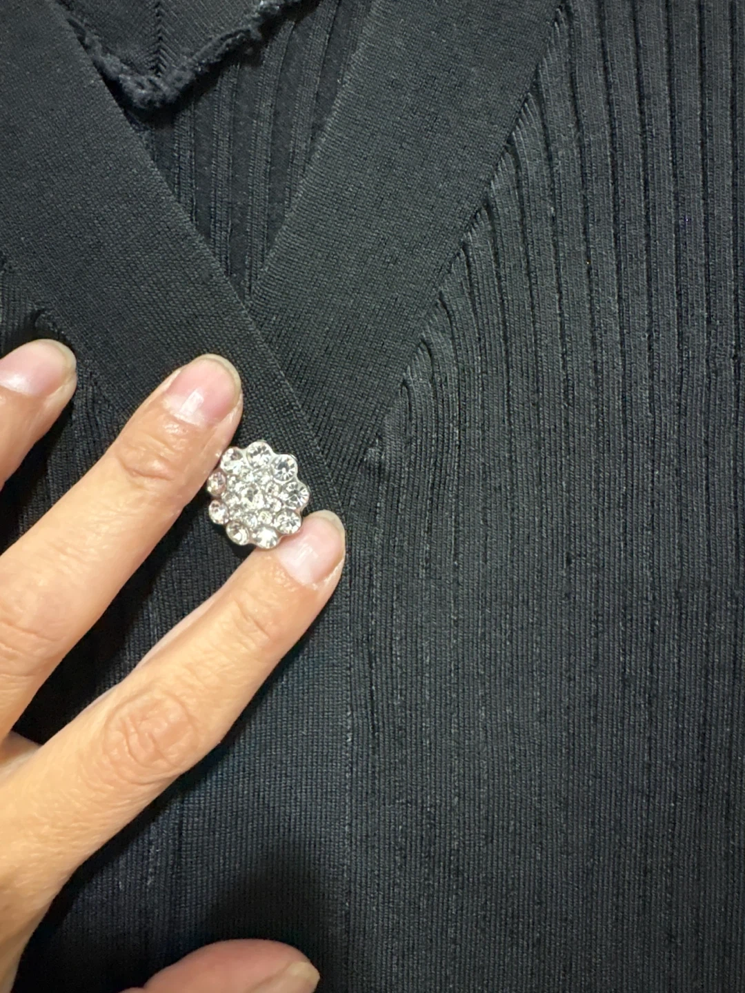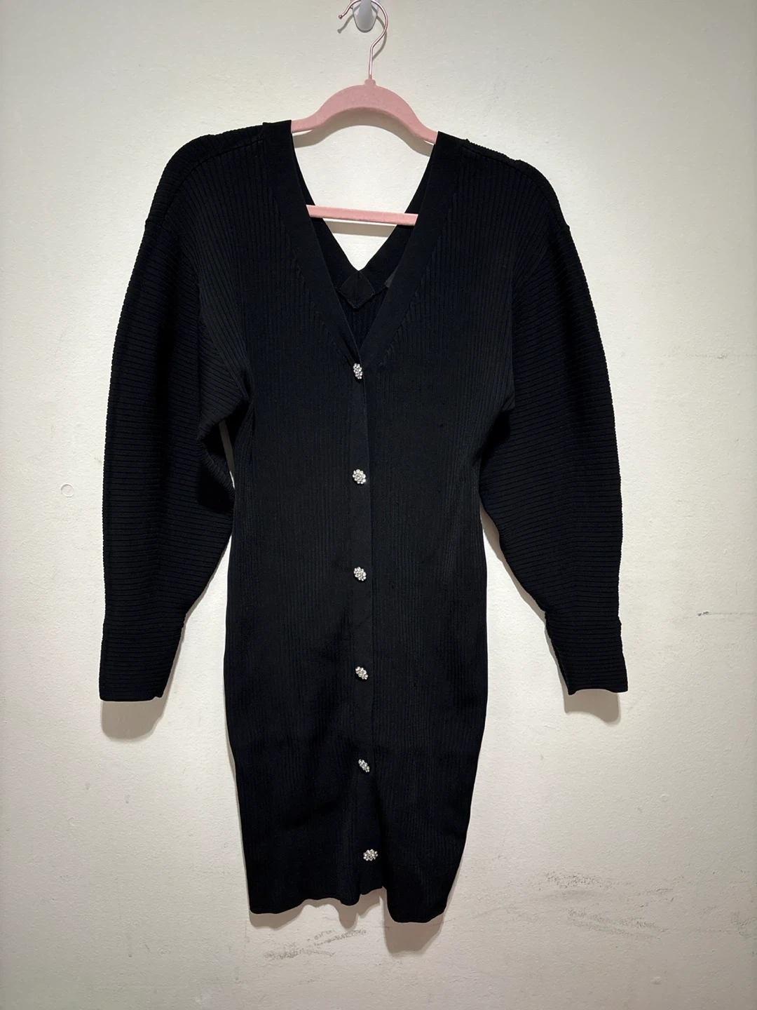 Selling a cute black ribbed knit dress from Express! It's a size medium and features a flattering V-neck with decorative buttons. Perfect for a night out or a casual day!