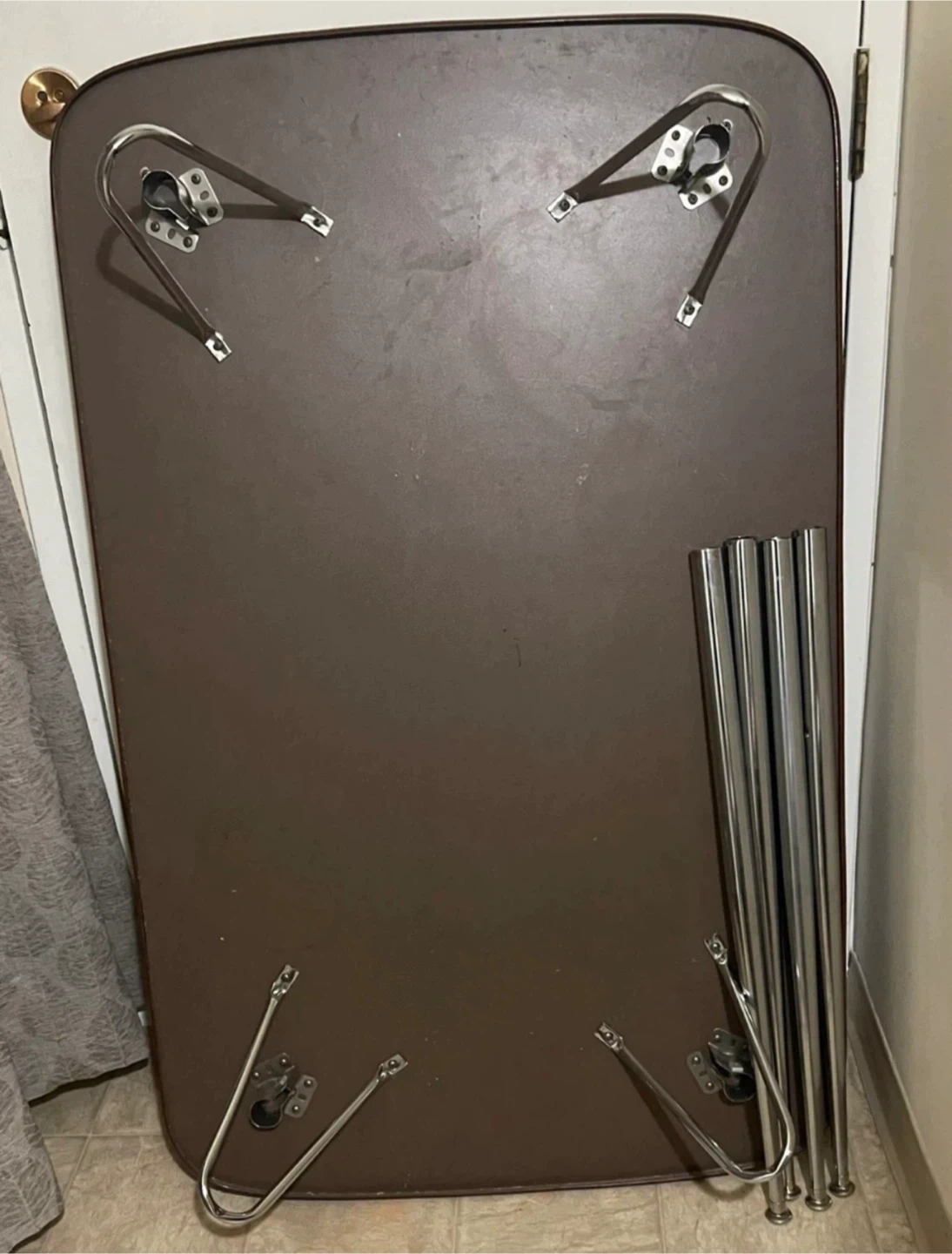 Selling a sturdy brown dining table. It comes with detachable silver metal legs for easier transport. Easy to assemble. The table has a unique, retro look, and it's perfect for any kitchen, dining space, patio, balcony, or porch . It can also be used as a desk. The metal chairs in the picture are not included, and are not available. Very good condition. From smoke-free, pest-free, and pet-free home.