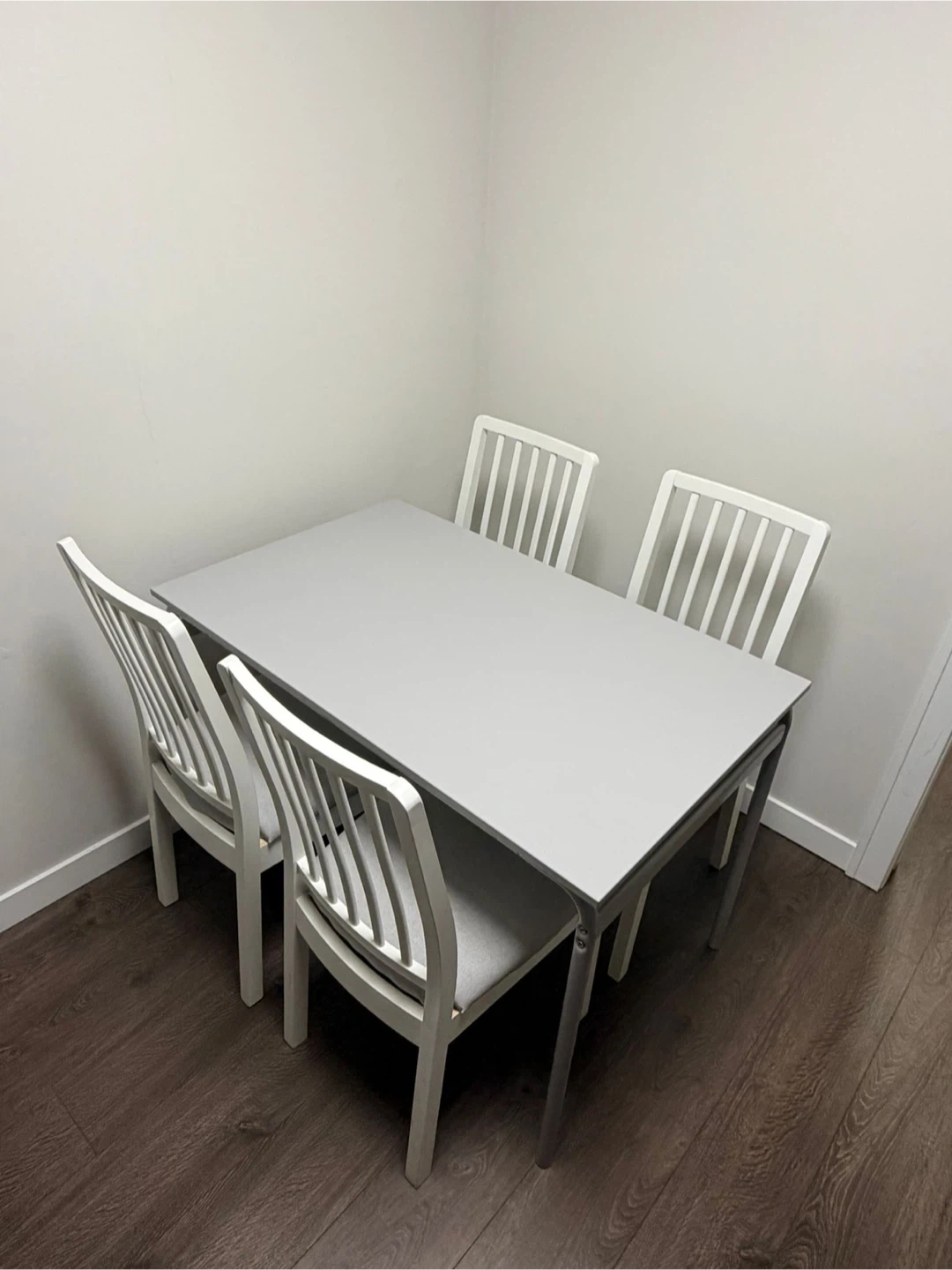 IKEA Ekedalen Dining Set – includes 4 grey/white chairs (with removable and washable covers) and the Grasala dining table. Stylish, functional, and in great condition. Table can be used for working spaces as well.