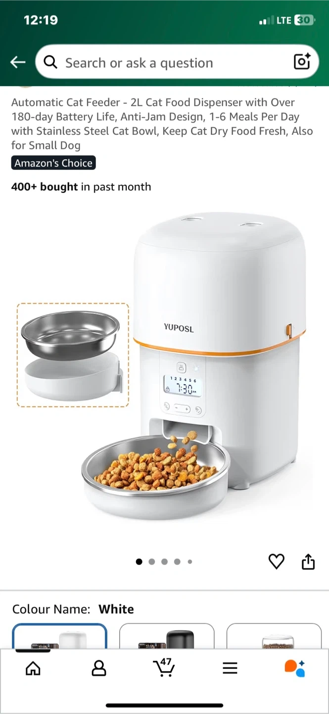 Selling a YUPOSL automatic cat feeder! It's a 2L dispenser in white. It can dispense 1-6 meals per day and has an anti-jam design. It also comes with a stainless steel cat bowl to keep your cat's dry food fresh