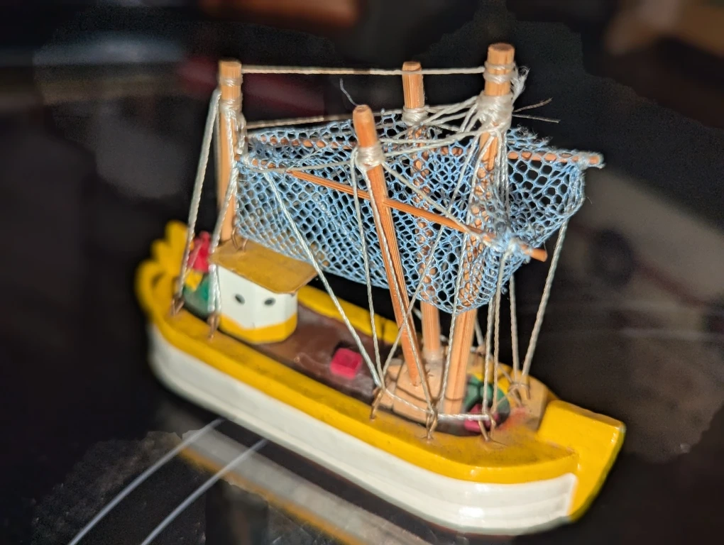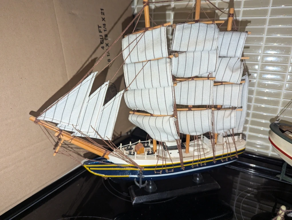 I'm selling these charming handcrafted wooden model fishing boats. They would make a great addition to any nautical collection or as a decorative piece for your home or business. The details are quite lovely! Set of five boats, two tall ships and three fishing trawlers. These were purchased from my travels to Greece over the years. Fishing trawlers were hand made from a retired Mariner , from the island of Skopelos.