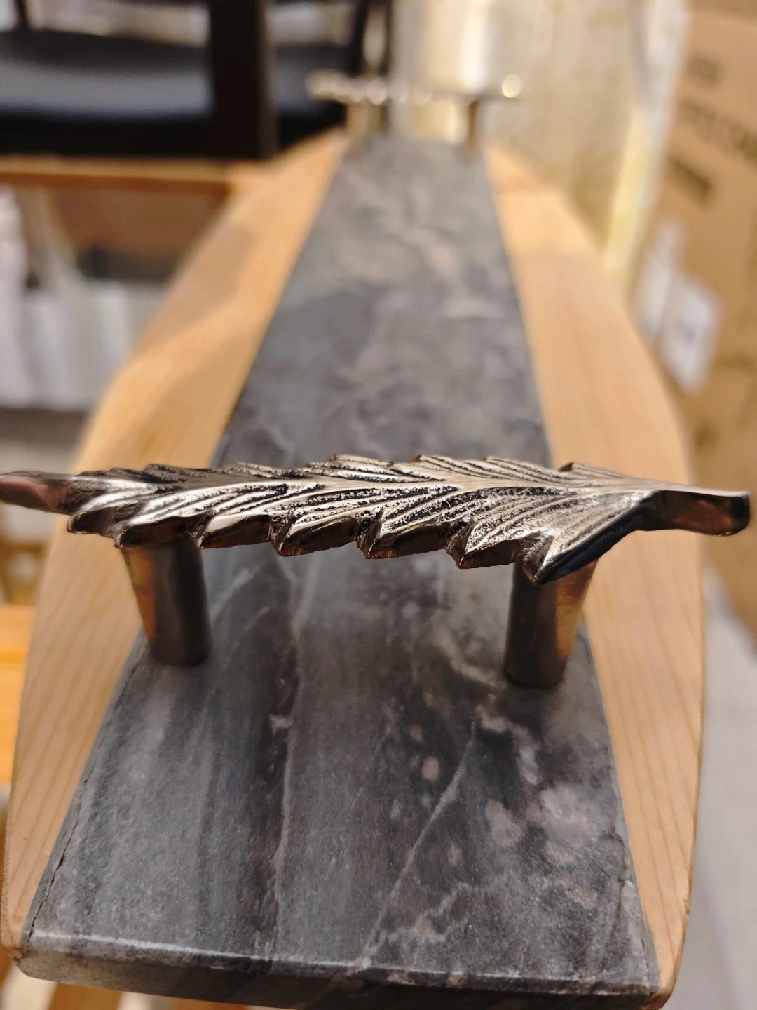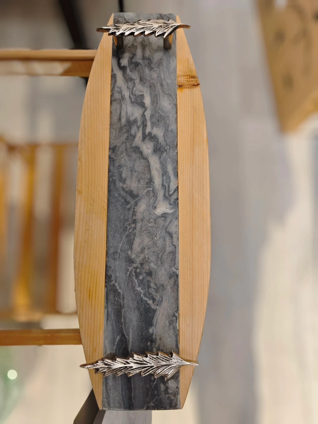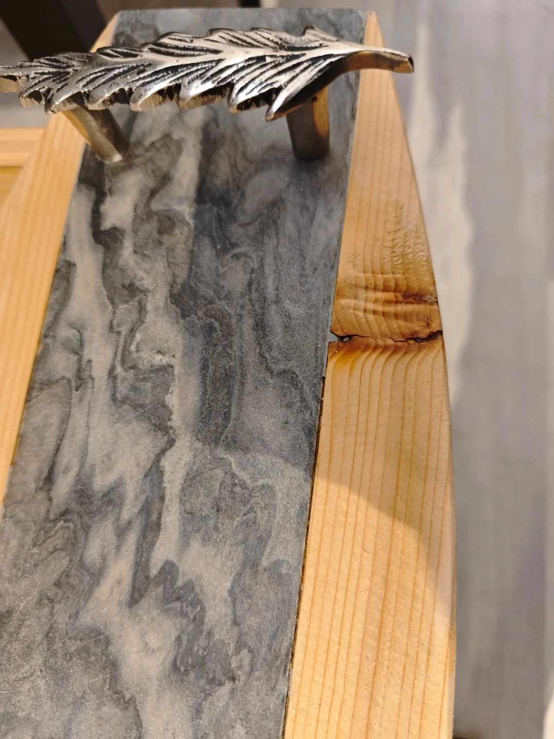 Selling a lovely wooden serving tray with a marble inlay and unique leaf-shaped handles. It would be perfect for serving snacks or displaying items in your home. The combination of wood, marble, and the decorative handles gives it a rustic yet elegant feel!
