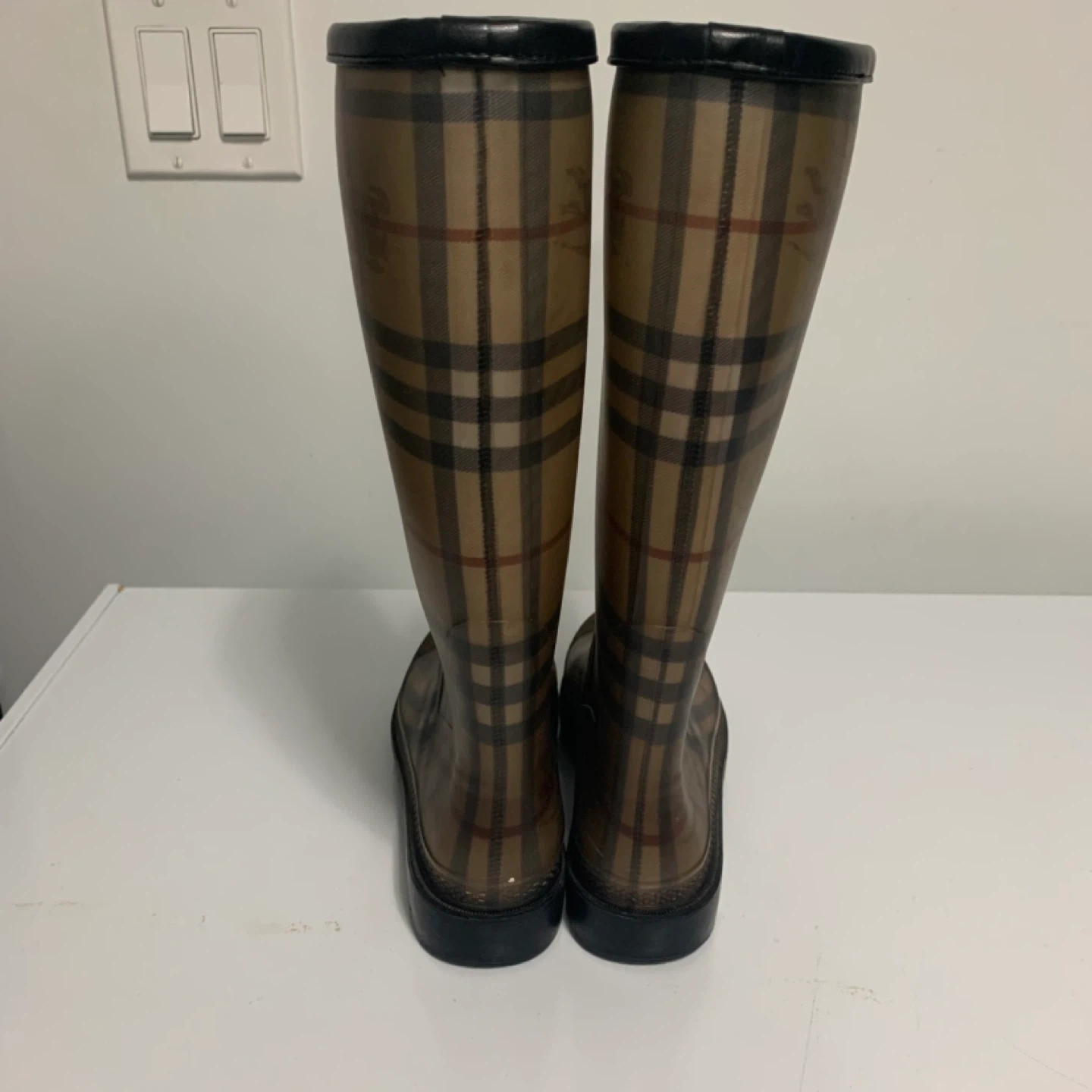 Selling a pair of Burberry rain boots in size 8.They have the classic Burberry plaid pattern and are perfect for rainy days!