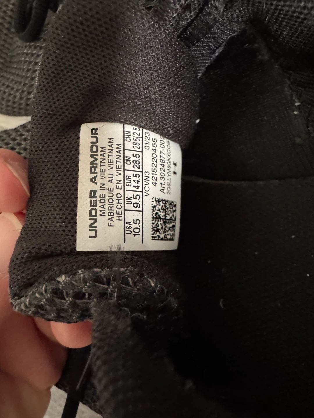 Selling a pair of Under Armour Charged Rogue 3 running shoes in men's size 10.5 US. They are black with the white Under Armour logo. The shoes show some signs of wear, as seen in the photos.