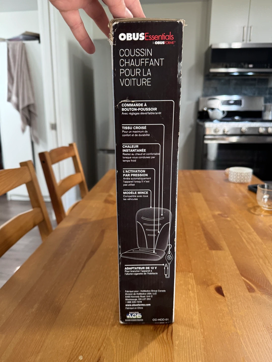 Selling a brand new ObusForme heated car cushion, still in its original box! It features instant back and seat heat, perfect for all vehicles. It also has push-button hand control and pressure-activated auto shut-off. Get ready for instant heat for all-weather driving comfort!