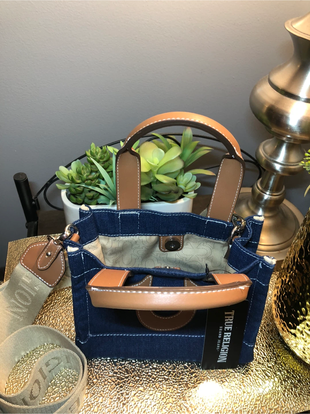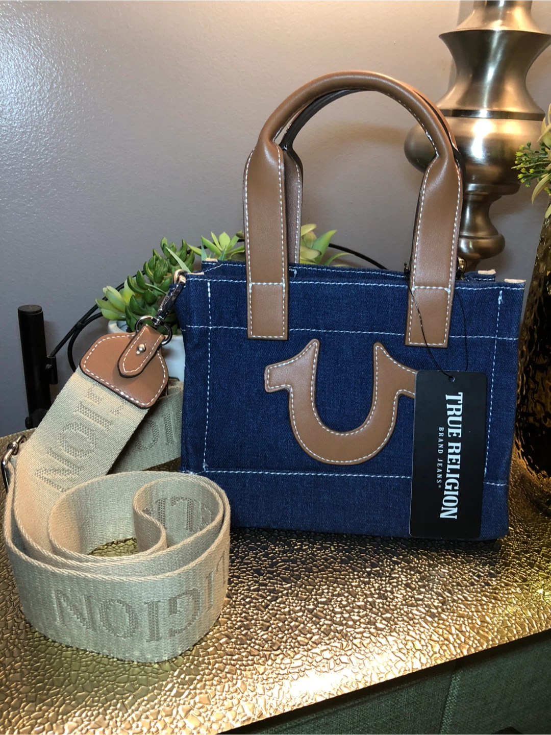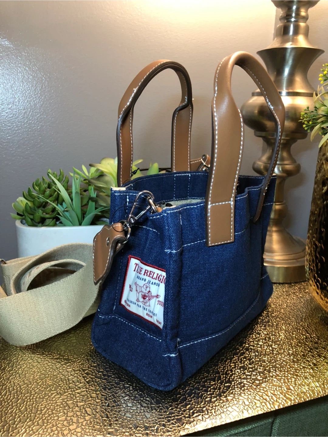 This is a cute True Religion denim tote bag! It features brown leather handles and trim, with a detachable shoulder strap. Perfect for everyday use!