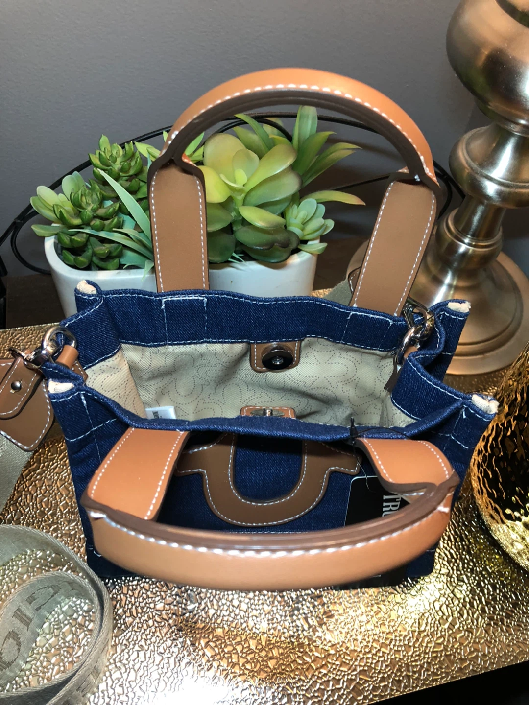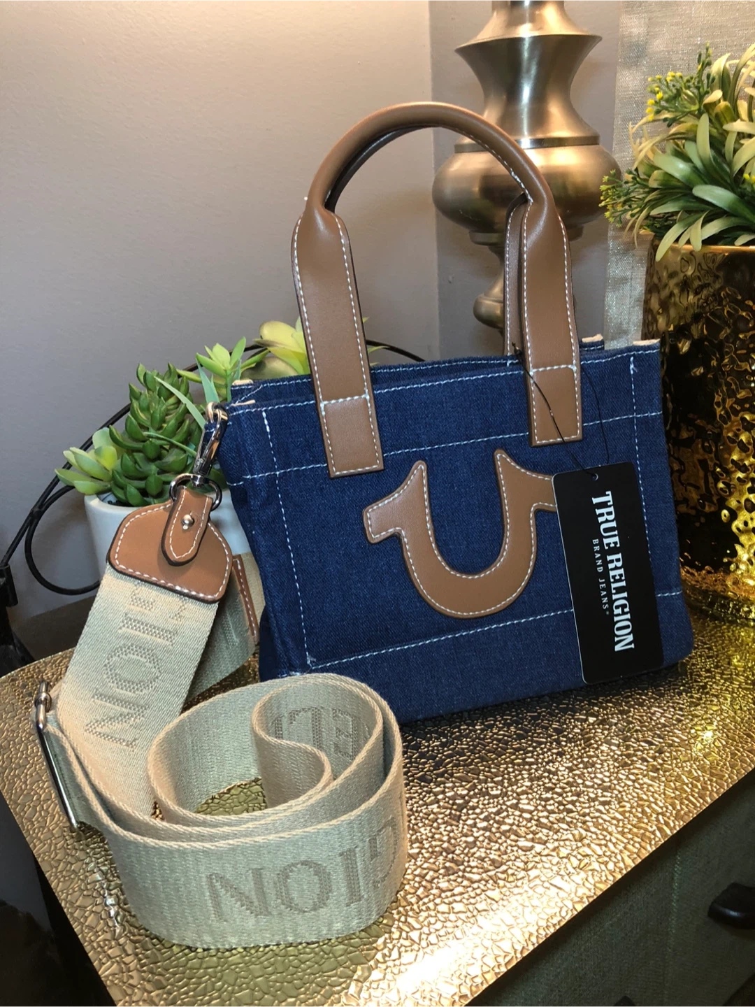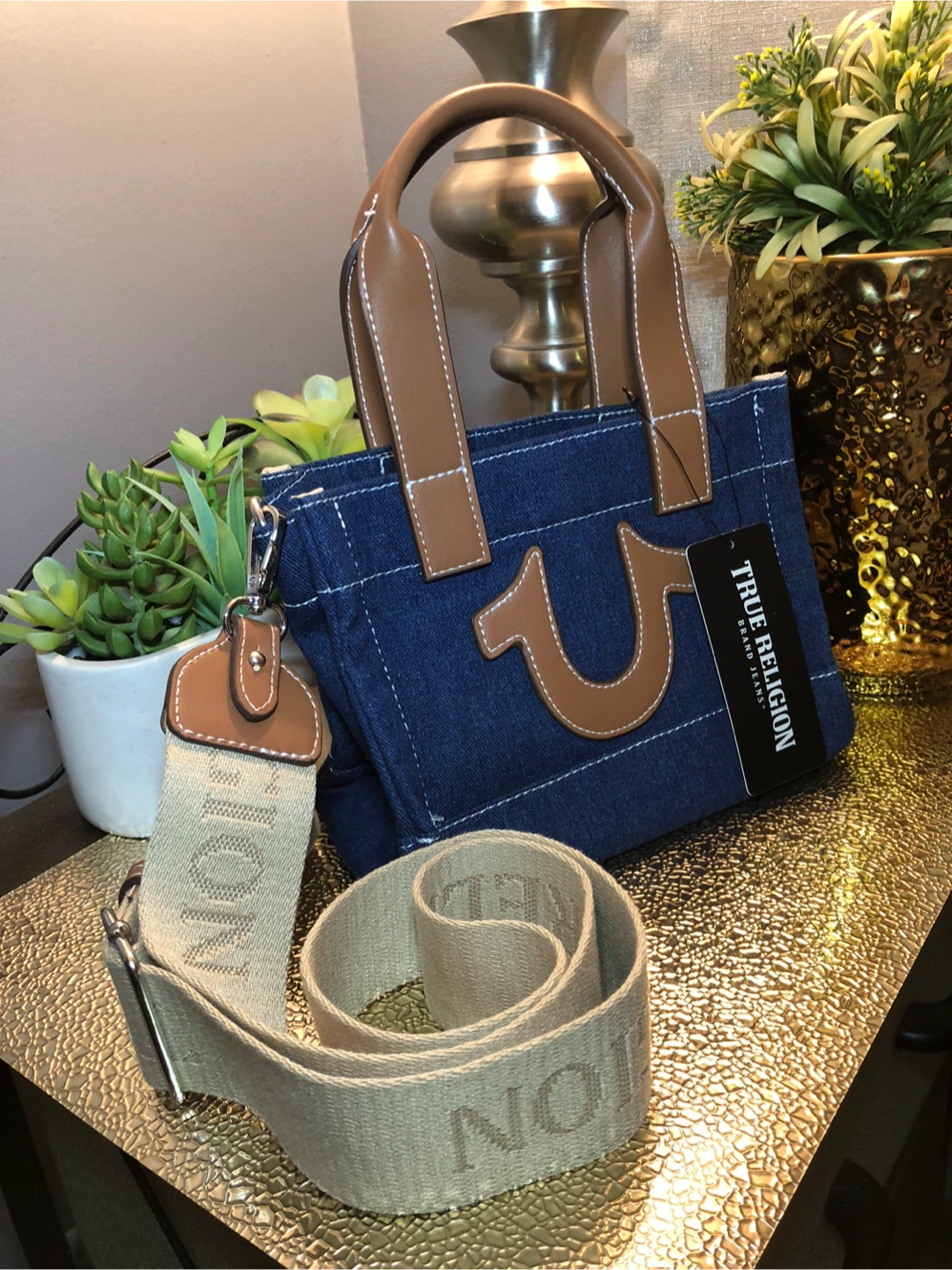 This is a cute True Religion denim tote bag! It features brown leather handles and trim, with a detachable shoulder strap. Perfect for everyday use!