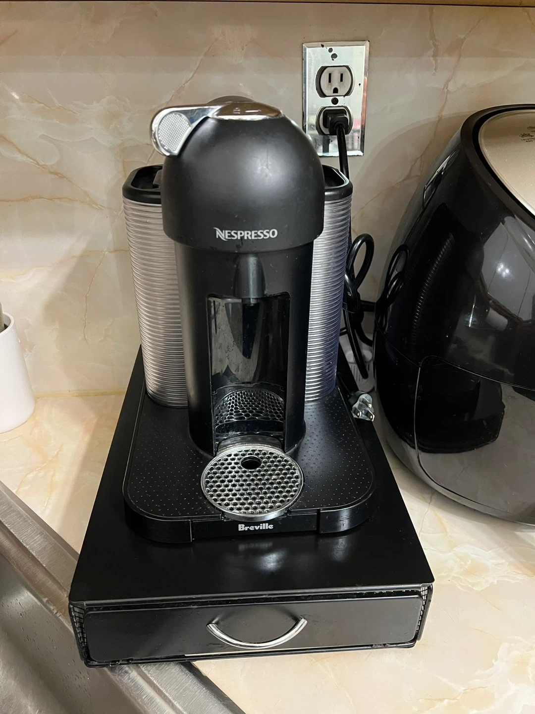 Selling a Nespresso Vertuo Next coffee machine paired with a Breville capsule drawer! This sleek black setup is perfect for any coffee lover. The Vertuo Next is known for its ability to brew a variety of coffee sizes with just the touch of a button. The Breville capsule drawer keeps your capsules organized and easily accessible