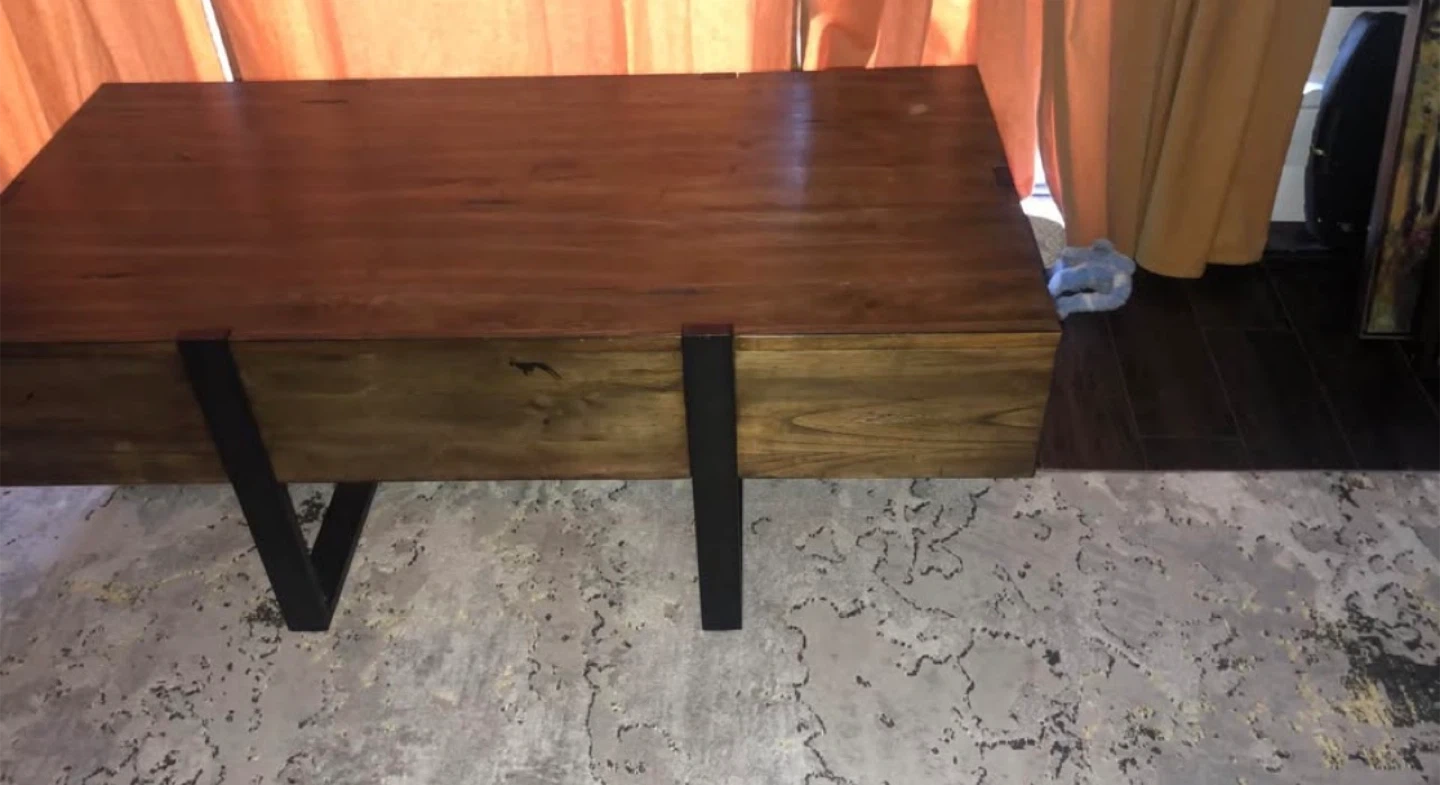 Selling a sturdy wood coffee table with black metal legs. It has a rustic look and is perfect for a living room or den. There are a few minor scratches and signs of wear, but overall it's in good condition and ready for a new home!