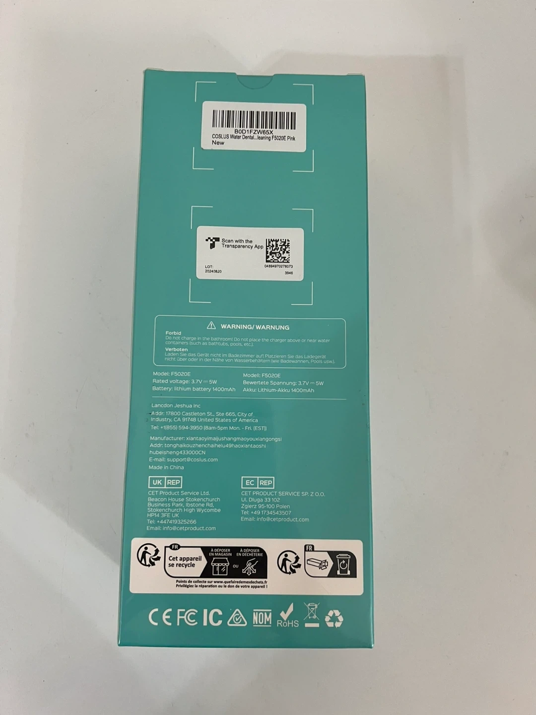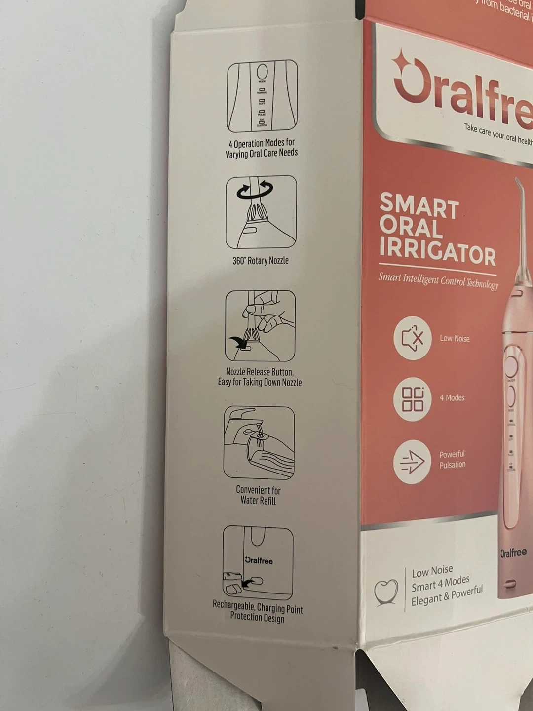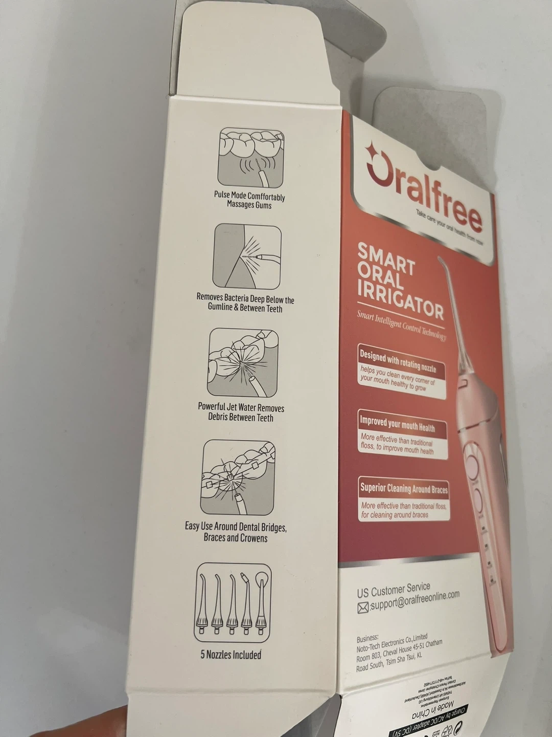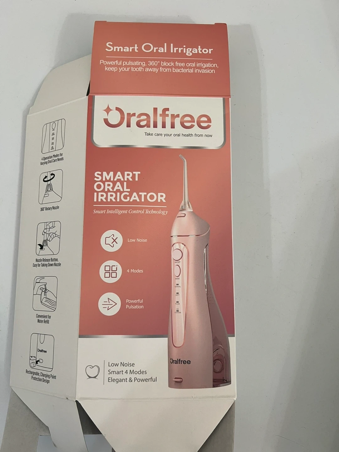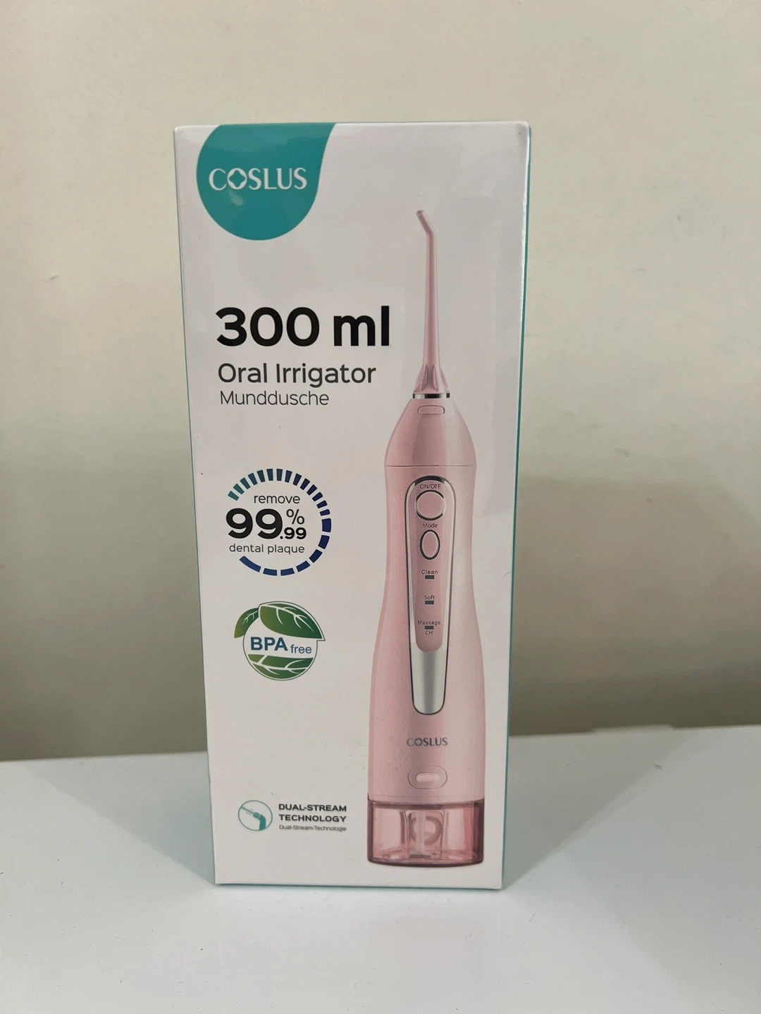 This is a brand new unopened box Coslus oral irrigator with a 300ml capacity. It comes in pink and features smart intelligent control technology. It's designed with a rotating nozzle and offers superior cleaning around braces. The box includes 5 nozzles