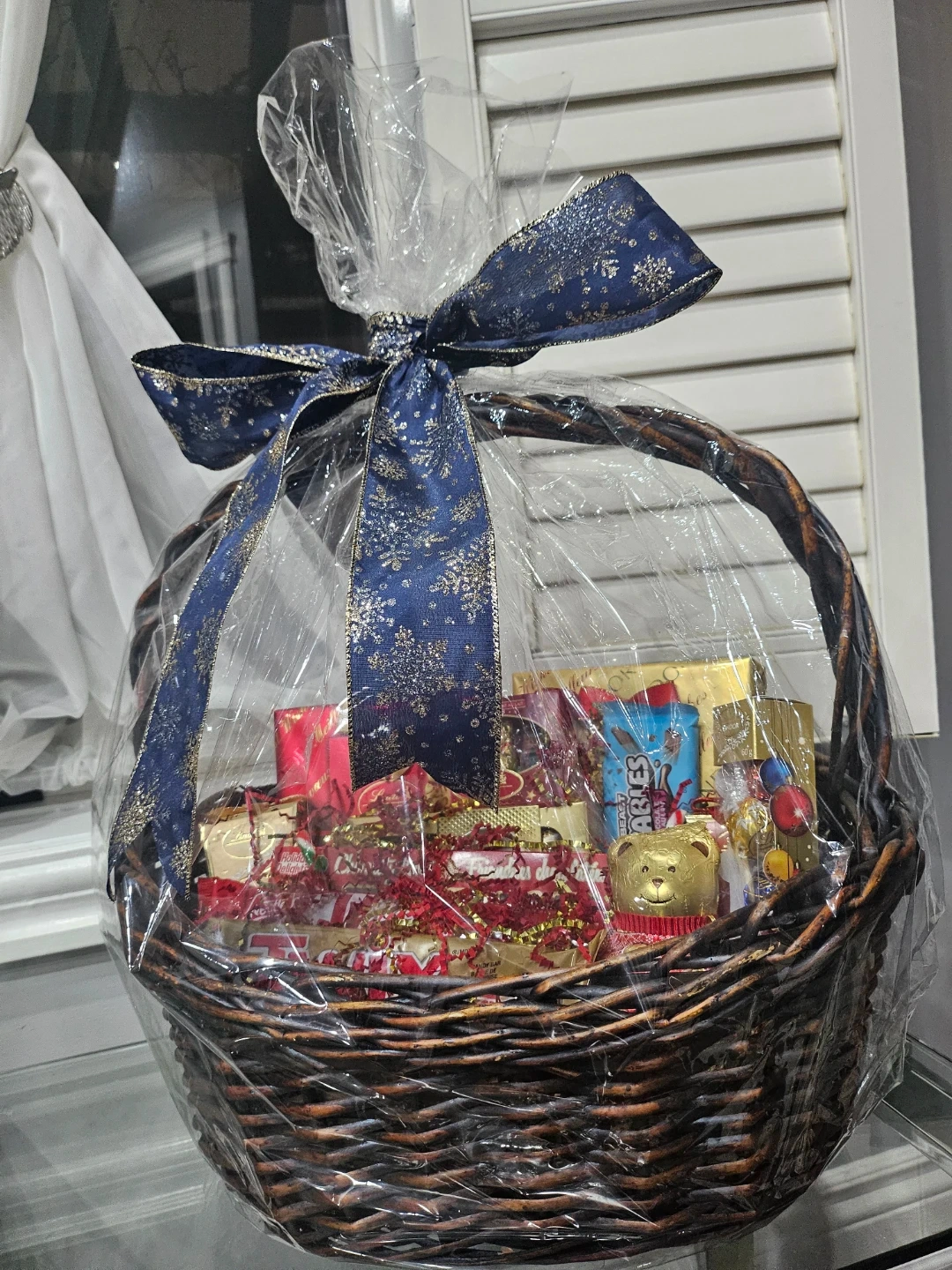 Selling a chocolate gift basket filled with a variety of treats! It includes Lindor chocolates, Kit Kat, Twix, and other delicious snacks. Perfect for a gift or just to treat yourself