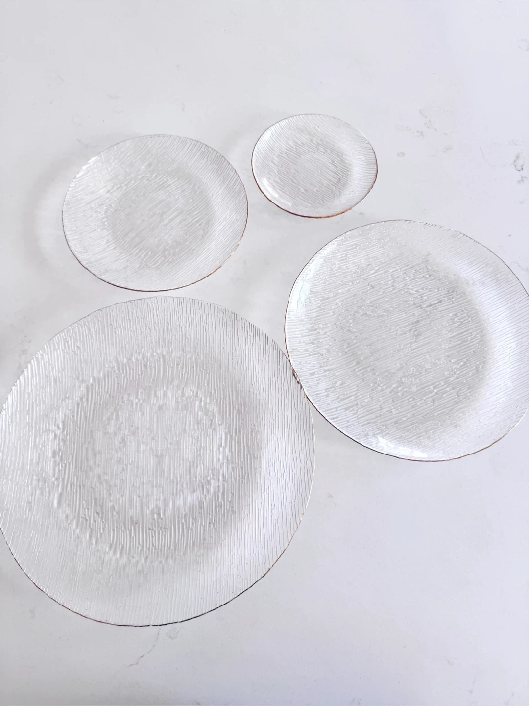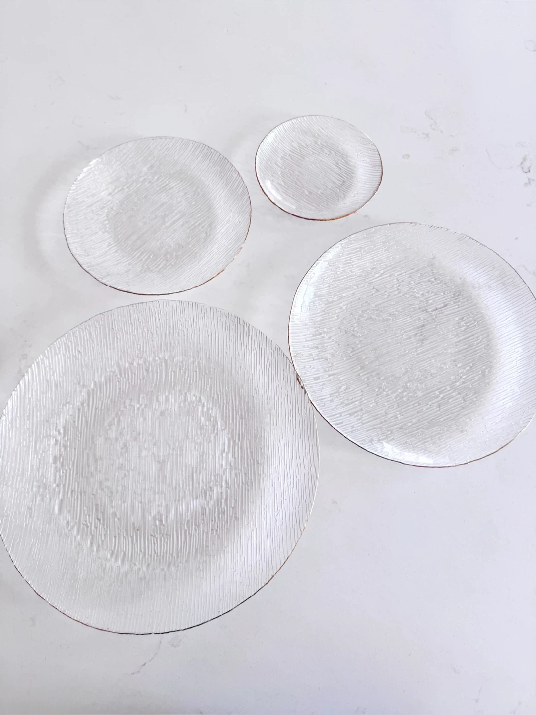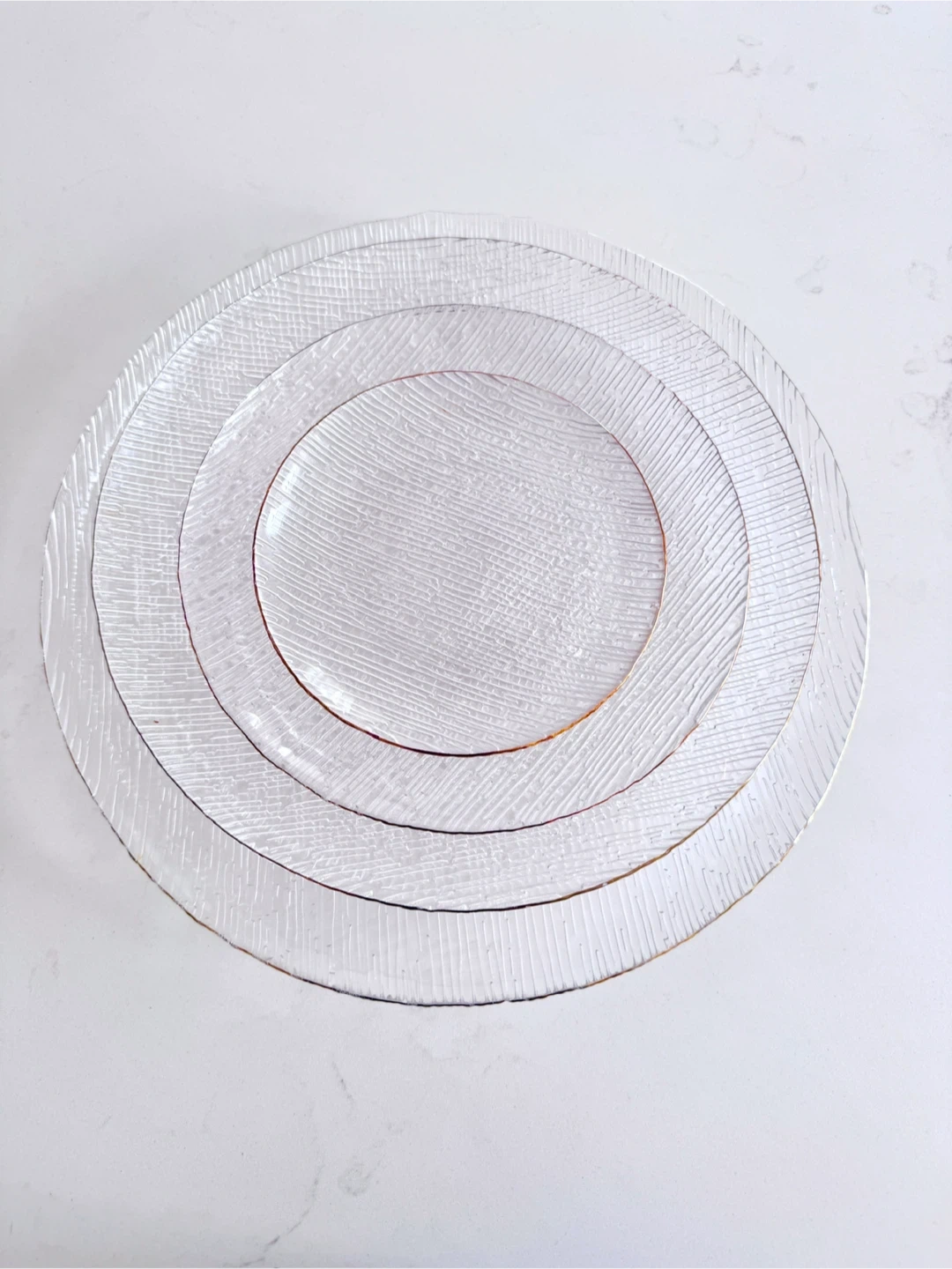 Selling a set of textured glass charger plates, each featuring a delicate gold trim. These plates add a touch of elegance to any table setting. Perfect for special occasions or to elevate your everyday dining experience!