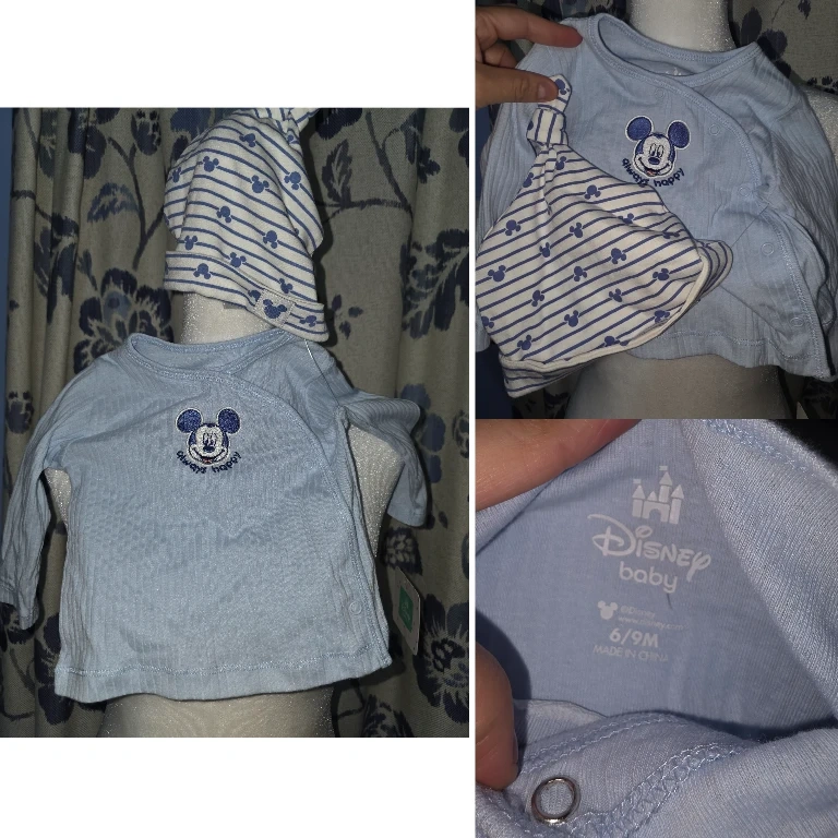 Cute Disney baby outfit in size 6/9M! It's a light blue color and includes both the top and a matching hat. The top has an adorable Mickey Mouse design with the words "always happy".