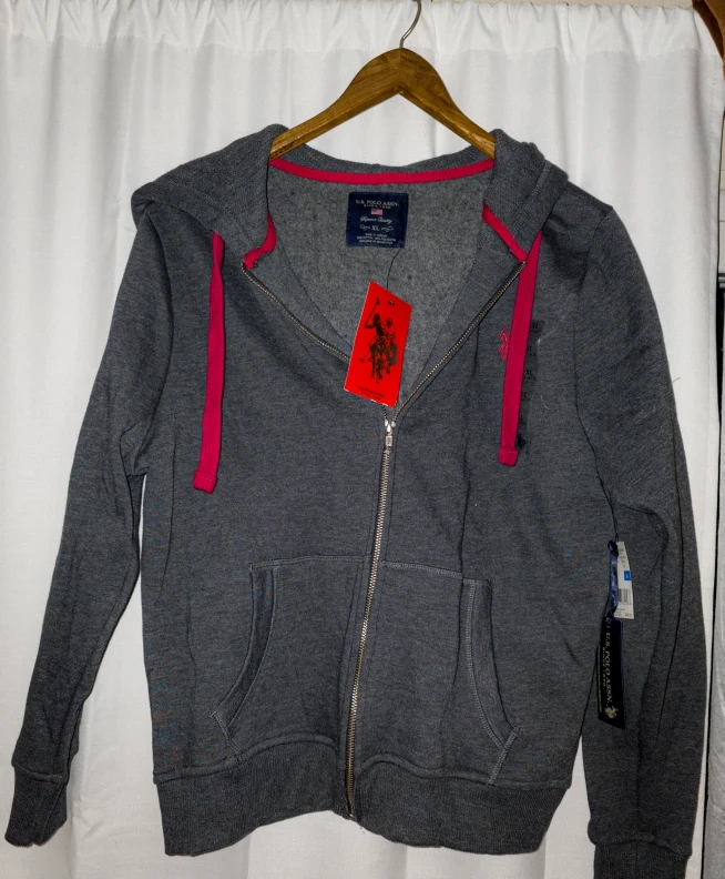 I'm selling a brand new U.S. Polo Assn. hoodie with tags still attached! It's a stylish gray color with red accents and a comfortable fit. It's a size XL and made in Jordan from 60% cotton and 40% polyester, exclusive of decoration