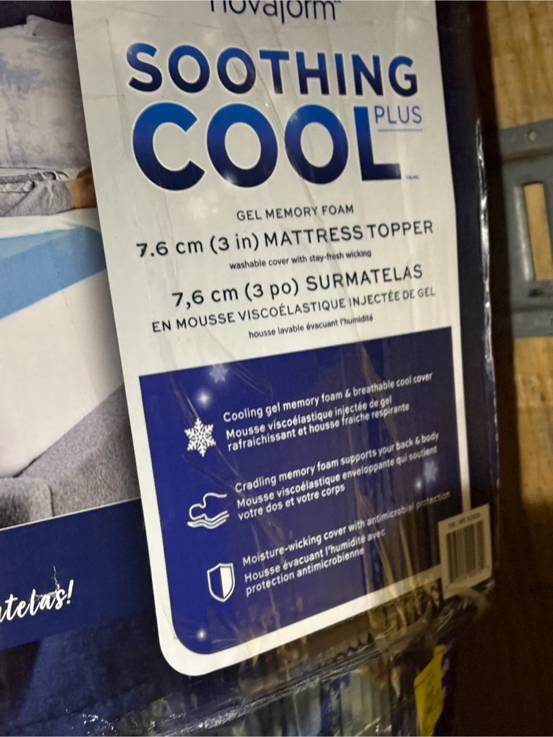 Selling a Novaform Soothing Cool Plus gel memory foam mattress topper! It's a queen size, 7.6 cm (3 in) thick, and has a washable cover with stay-fresh wicking. It also features a cooling gel memory foam and breathable cool cover, cradling memory foam that supports your back and body, and moisture-wicking cover with antimicrobial protection