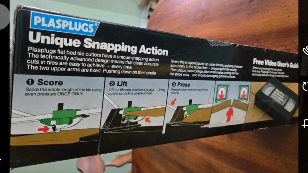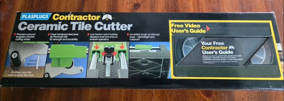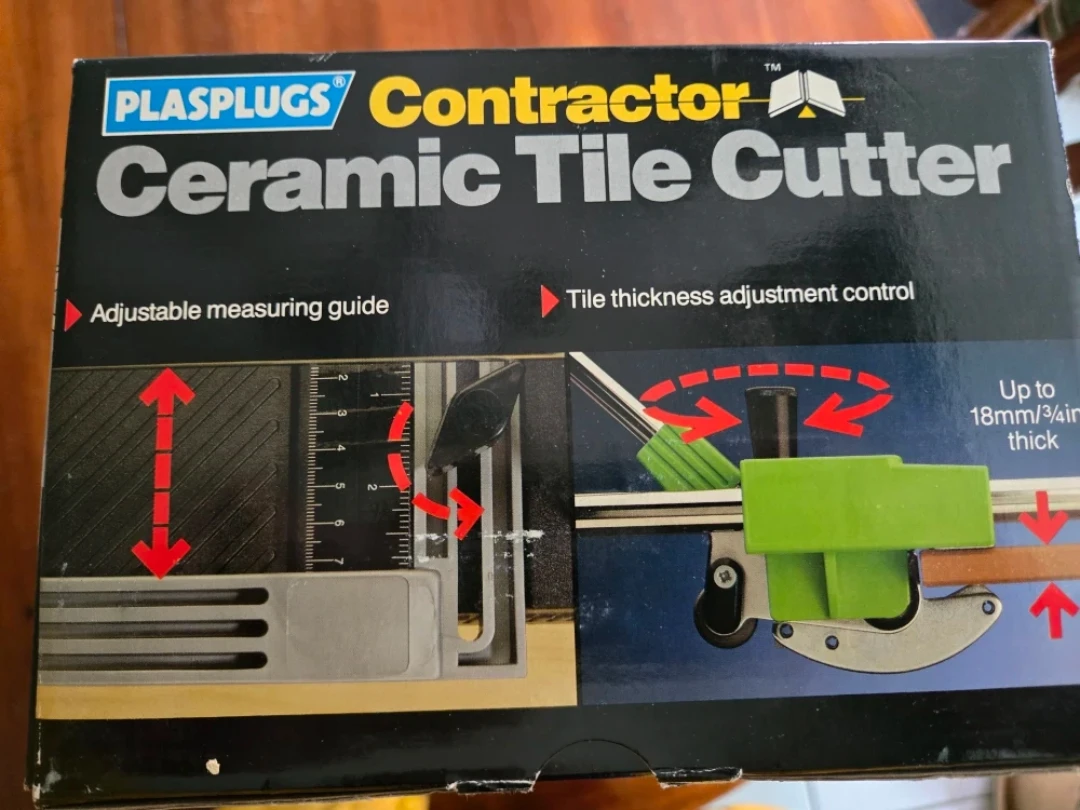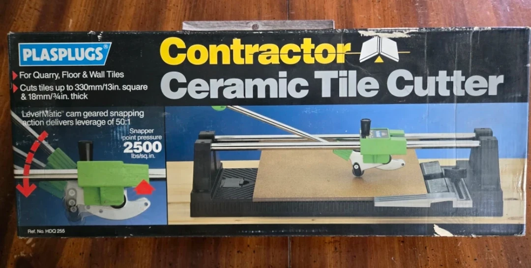 Selling a Plasplugs Contractor Ceramic Tile Cutter. Never been used. Still in its original box. It's designed for quarry, floor, and wall tiles, cutting up to 330mm/13in square and 18mm/3/4in thick. Precision ground tungsten carbide cutting wheel. Features LeverMatic cam geared snapping action that delivers leverage of 50:1. Snapper point pressure of 2,500 lbs/sq. in. Also includes a free video user's guide!