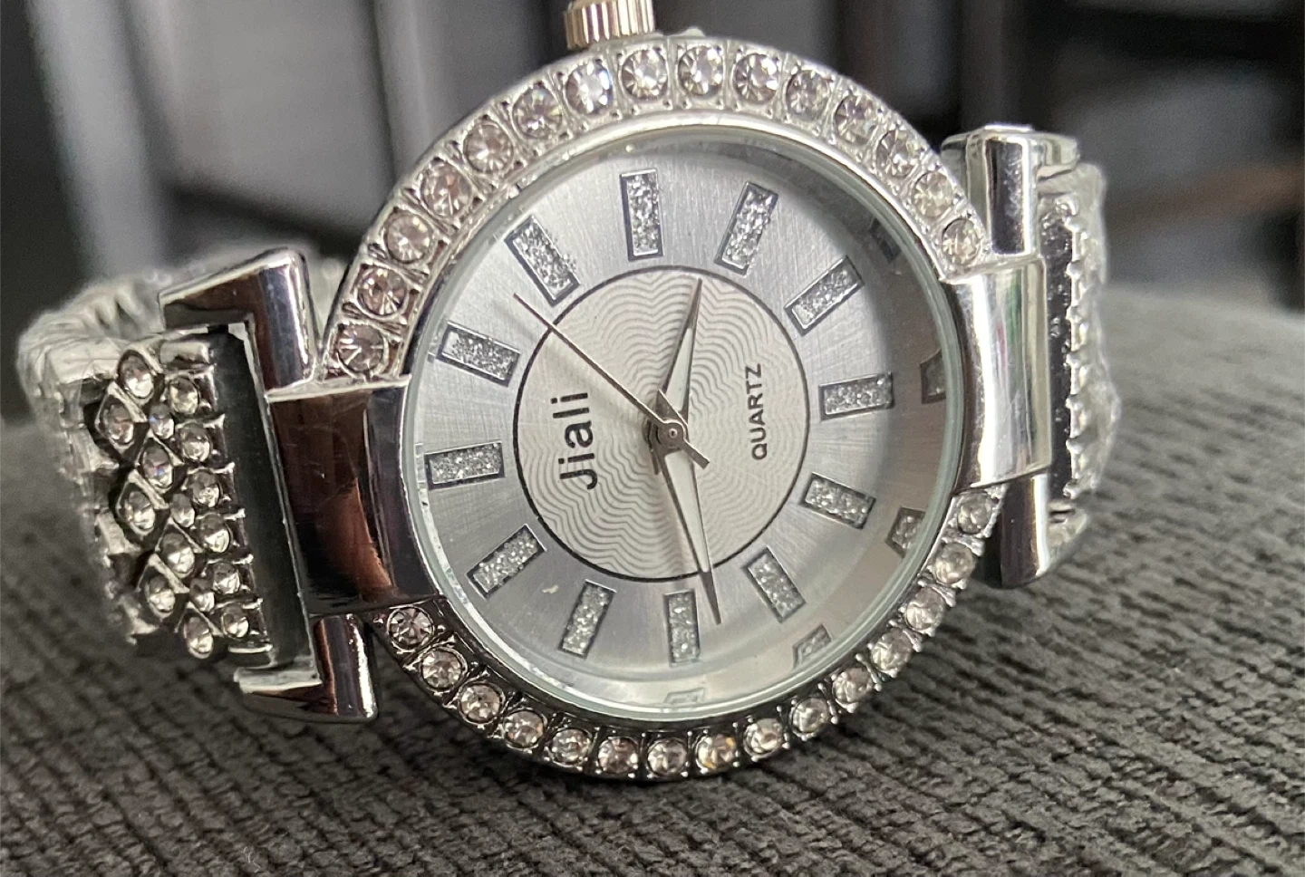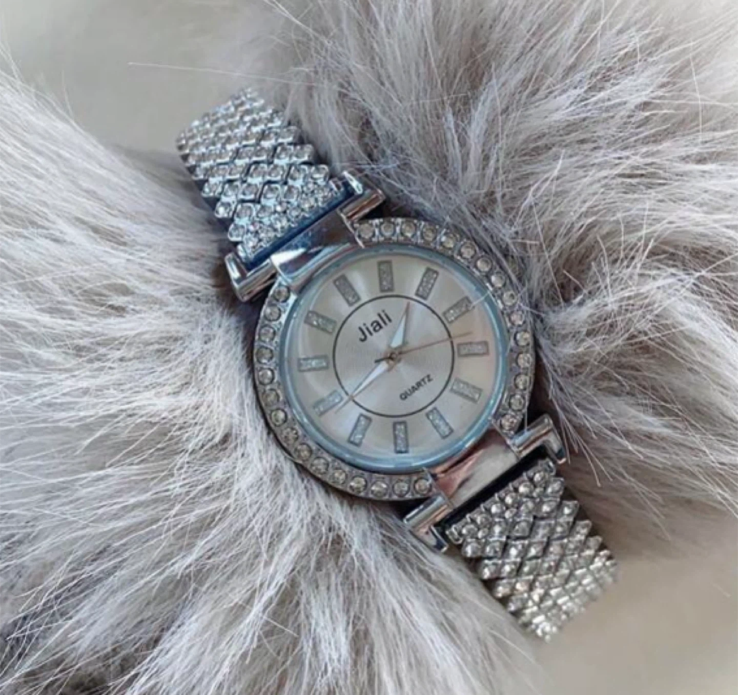 Selling a Jiali Quartz women's watch. It's a lovely silver colour and has a beautiful design with rhinestones around the face and band. It's in great condition and would make a wonderful addition to any outfit