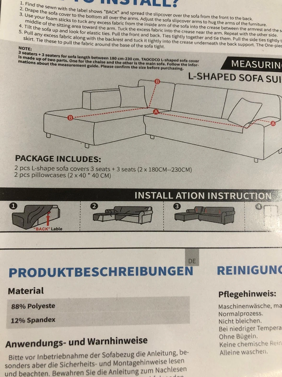 This TAOCOCO sectional couch cover is designed for L-shaped sofas with 3 seaters + 3 seaters, fitting sofas between 180cm-230cm. It's made of 88% polyester and 12% spandex for a comfortable and snug fit. The package includes 2 pieces: an L-shape sofa cover for 3 seaters + 3 seaters (2 x 180cm-230cm) and 2 pcs pillowcases (2 x 40 * 40 cm).