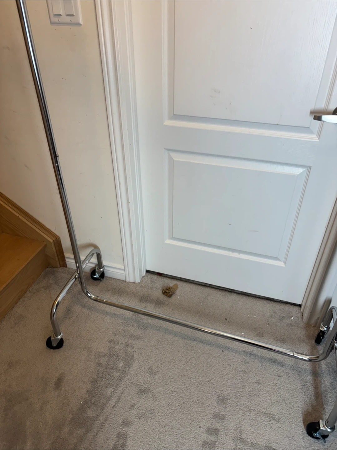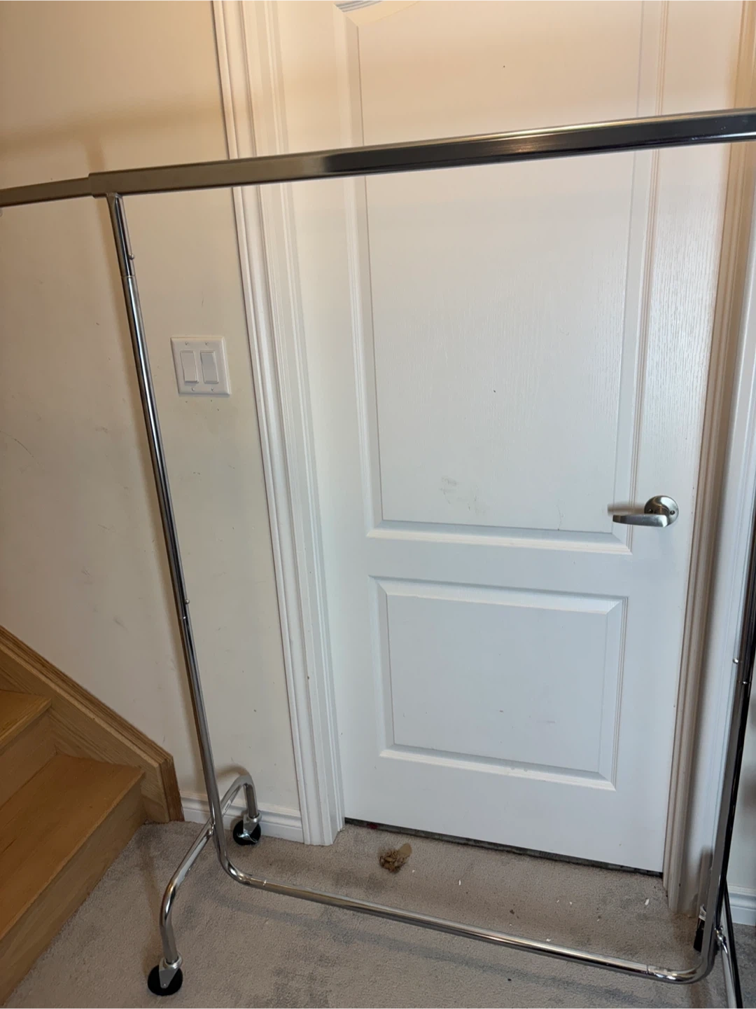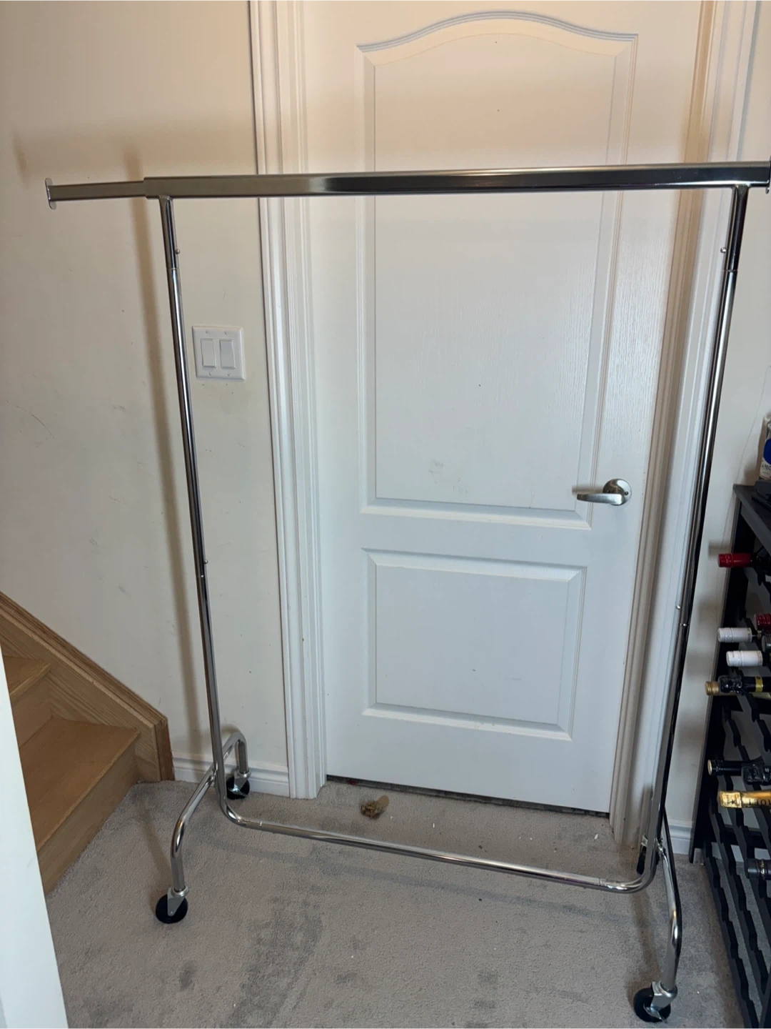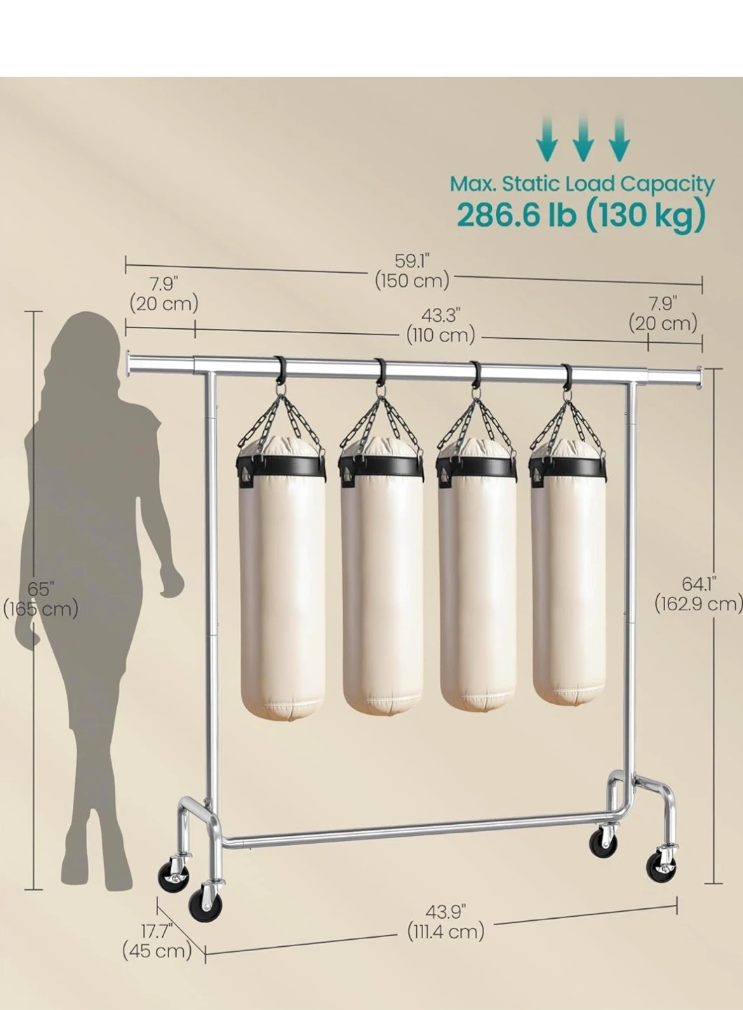 This is a rolling garment rack, perfect for organizing your clothes! It has a max static load capacity of 286.6 lb (130 kg). The dimensions are approximately 59.1" (150 cm) wide and 65" (165 cm) high.