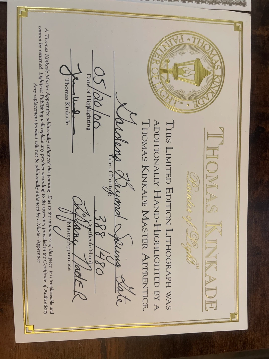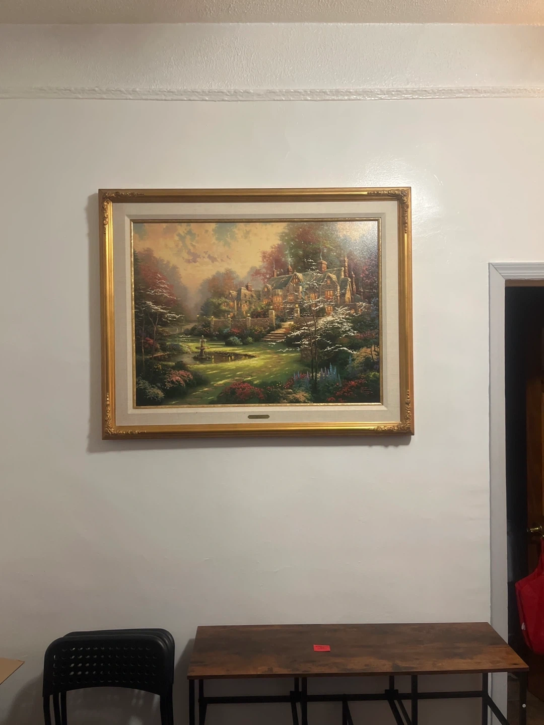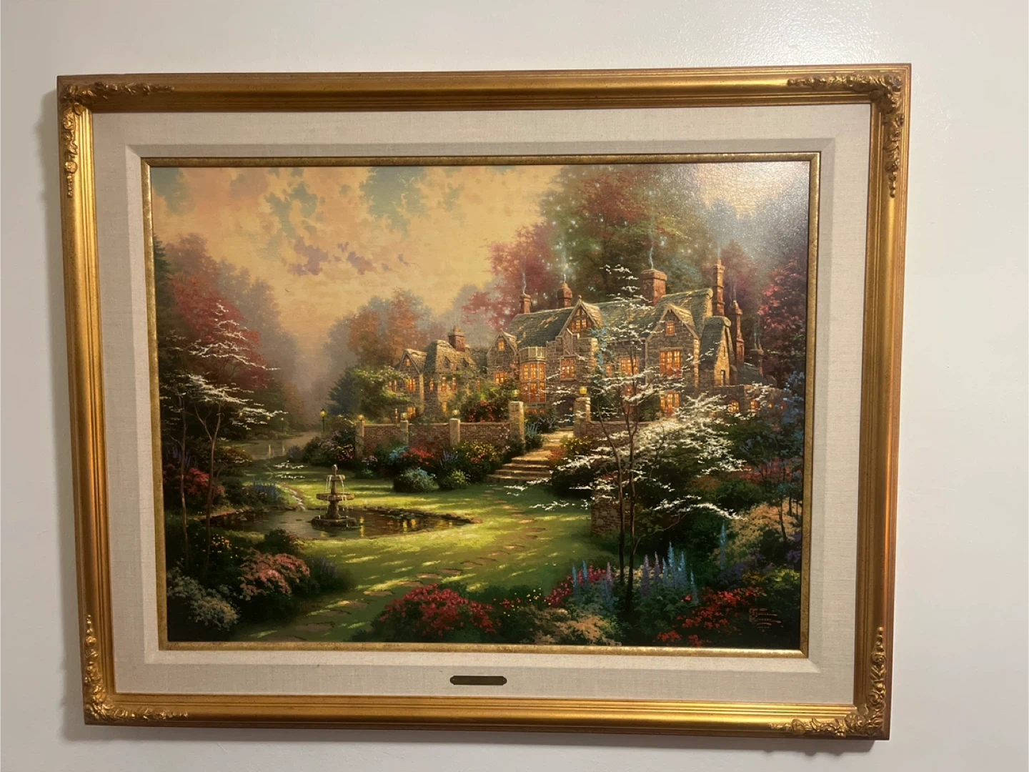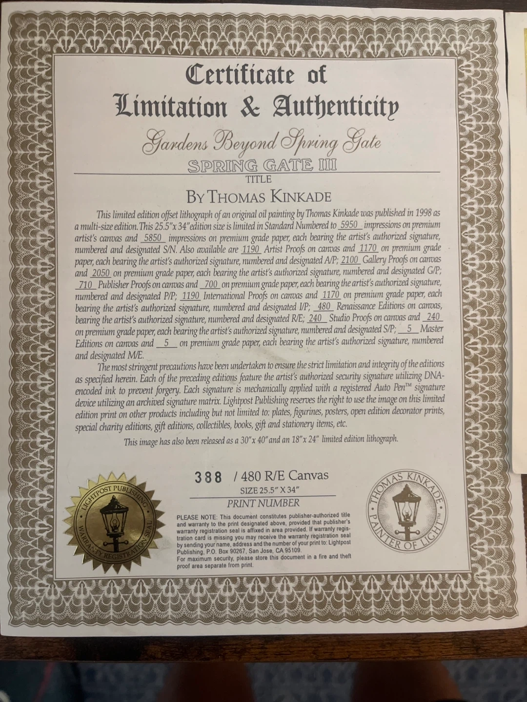 Selling a Thomas Kinkade limited edition lithograph titled "Gardens Beyond Spring Gate III". This piece is additionally hand-highlighted by a Thomas Kinkade Master Apprentice. It is number 388 out of 480. The print number is 25.5" x 34".
