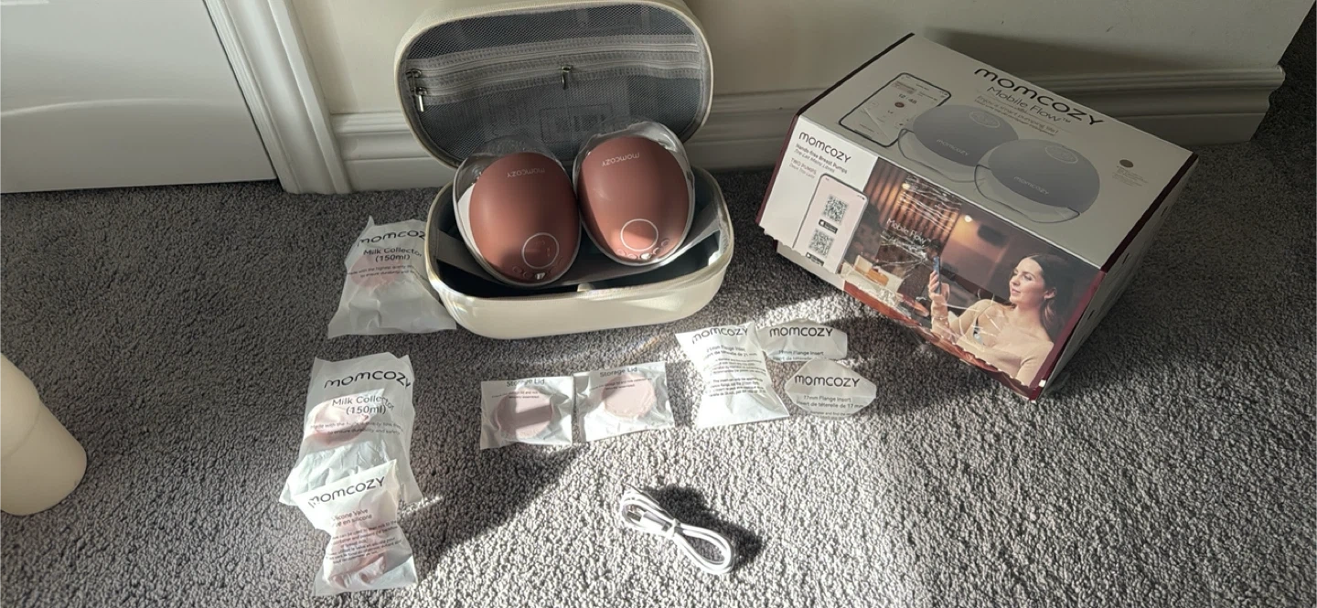 I'm selling a Momcozy Mobile Flow hands-free breast pump. It comes with the box and all original components, including milk collectors and storage lids. Perfect for busy moms!