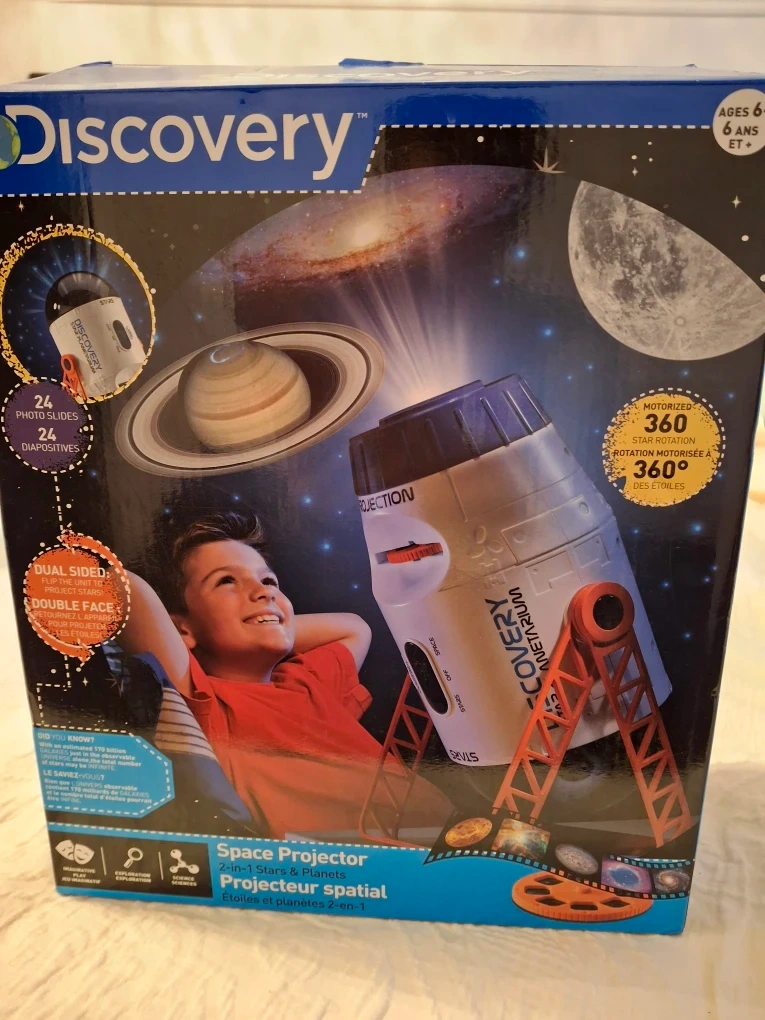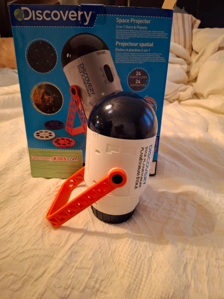 Selling a Discovery Space Projector! It's a 2-in-1 stars and planets projector that pivots, shining stars and planets onto ceilings and walls. It features 24 stunning images of planets, constellations, and spaceships. Enjoy a care-free battery operation!