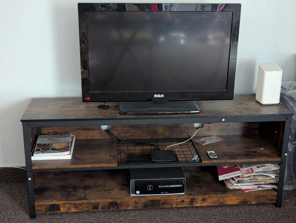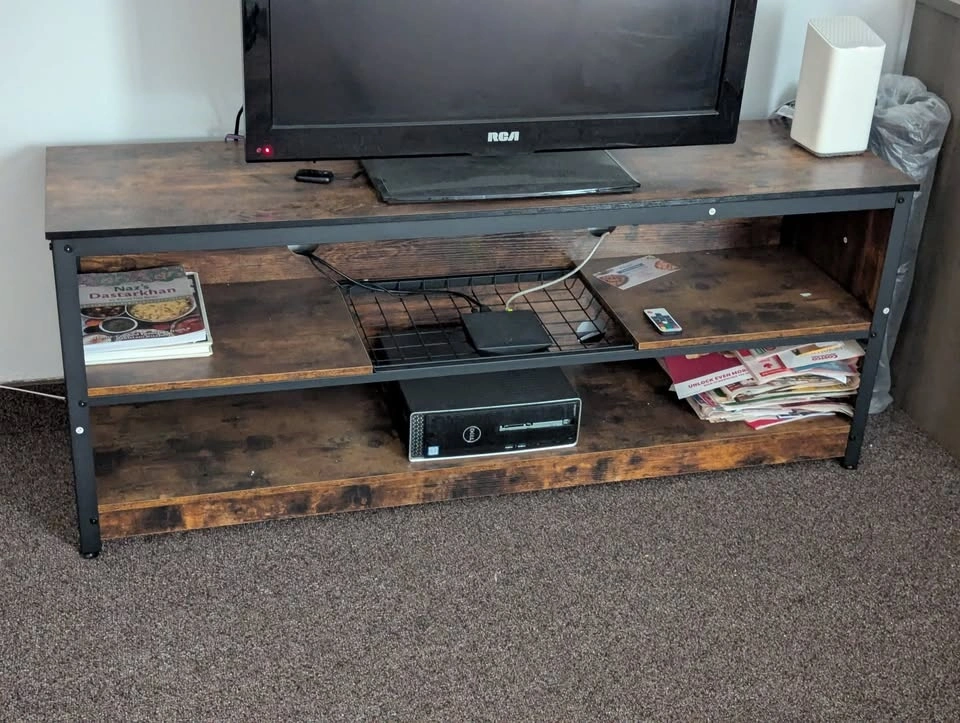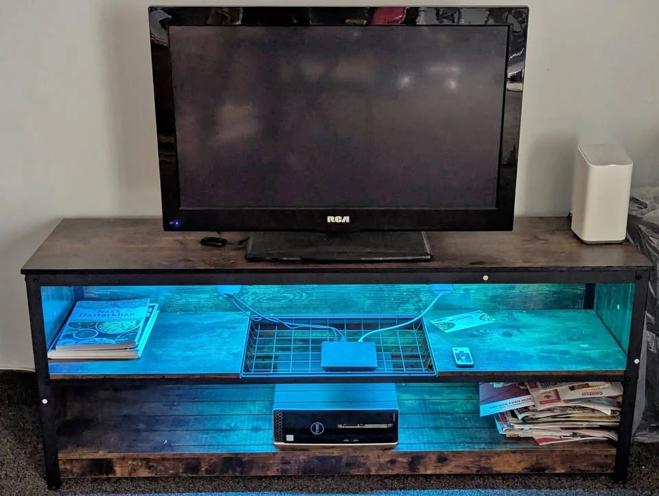 Bestier TV stand, ideal for 50/55/60 inch TVs. The middle mesh shelf can be adjusted left and right. Features remote control 7-color LED lights and 22 dynamic modes. It has 3 tiers open storage shelves and 4 cable holes on the back. Provides plenty of space to organize your media devices, remote controls, gaming consoles, DVDs, Xbox Console, etc. Made of P2 grade high quality particleboard and sturdy metal frame with adjustable feet. Can hold up to 240 pounds.