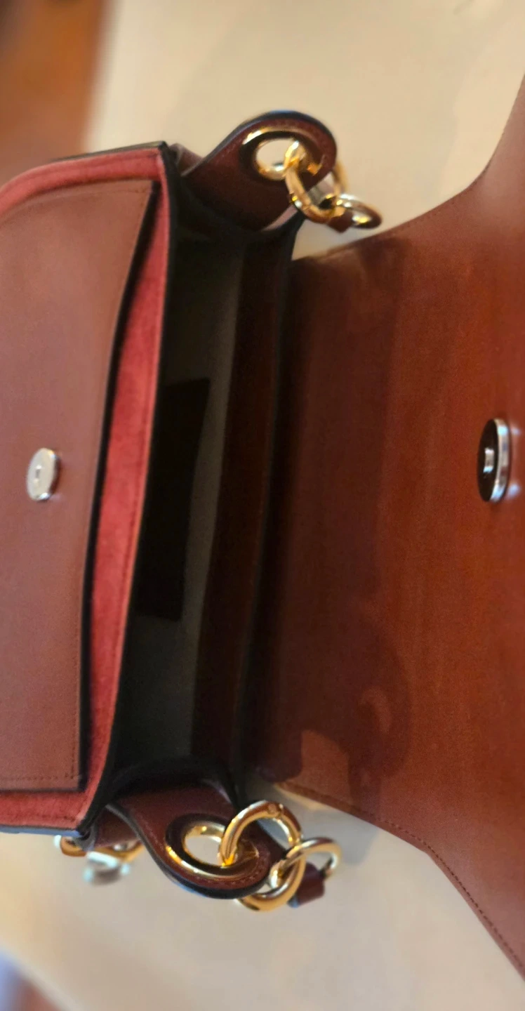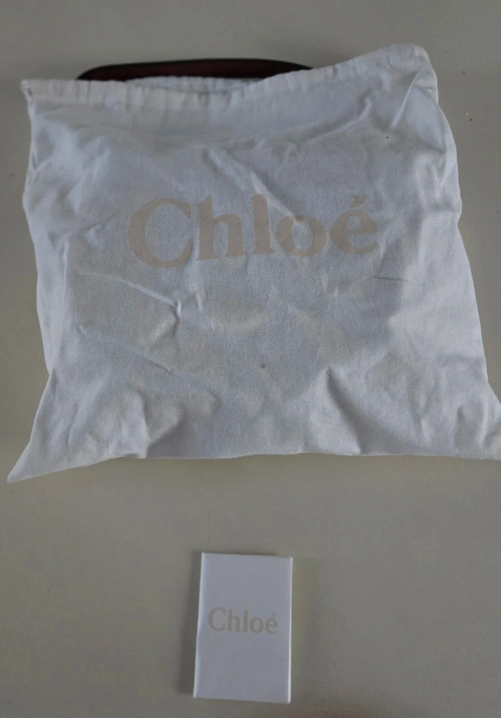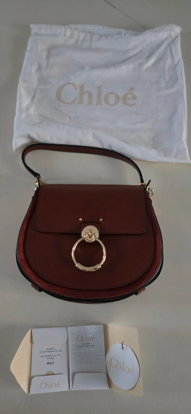 I'm selling a Chloé Tess bag in brown leather. It's in great condition and comes with its original dust bag. The bag features a distinctive gold ring detail and a detachable shoulder strap. Perfect for adding a touch of luxury to any outfit