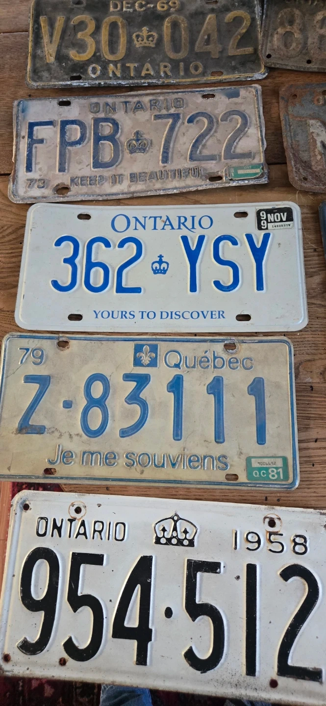 Selling a collection of 20 vintage license plates from Ontario and Quebec including 1 from Brazil. They range in years from the 1950s to the 1980s. Great for collectors or anyone looking for unique decor! $125 for everything seen
