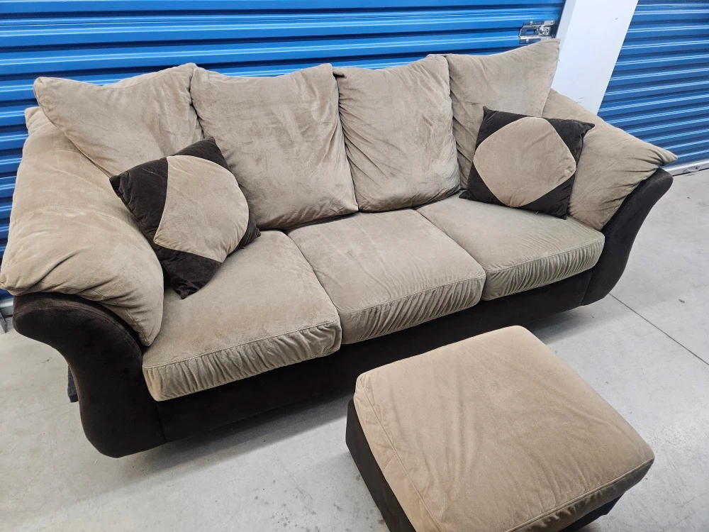 Selling a comfy sofa set that includes a 3-seater sofa, a 2-seater sofa, and an ottoman. The set features a beige and brown colour scheme. It's perfect for a living room or family room!