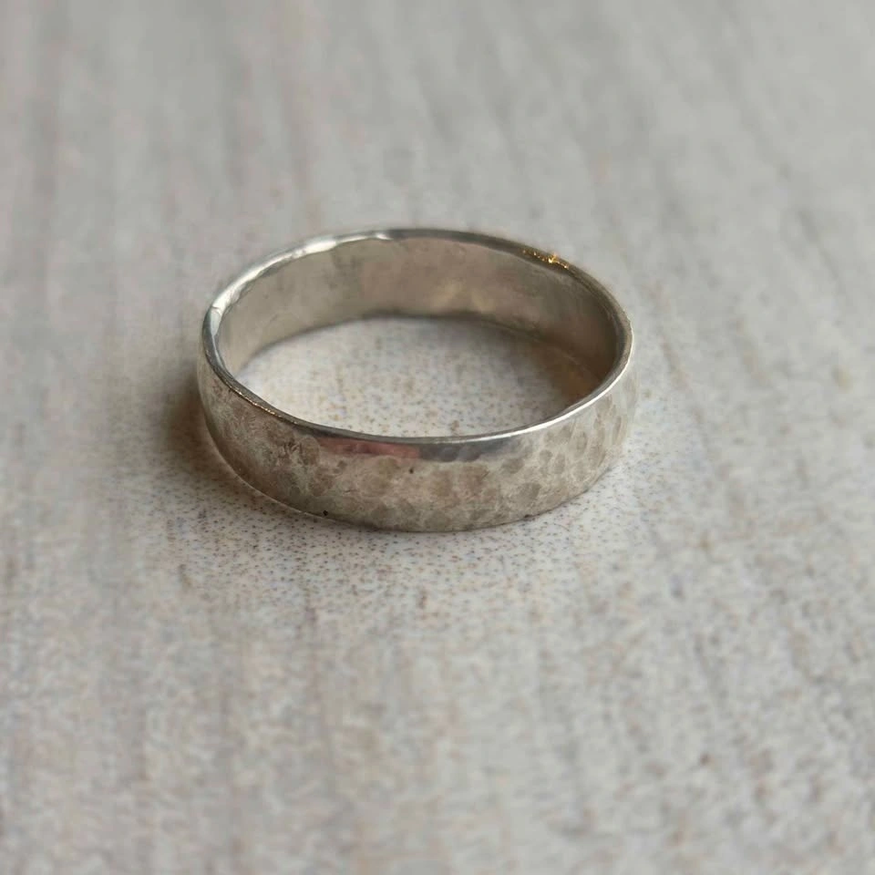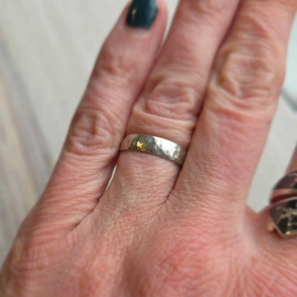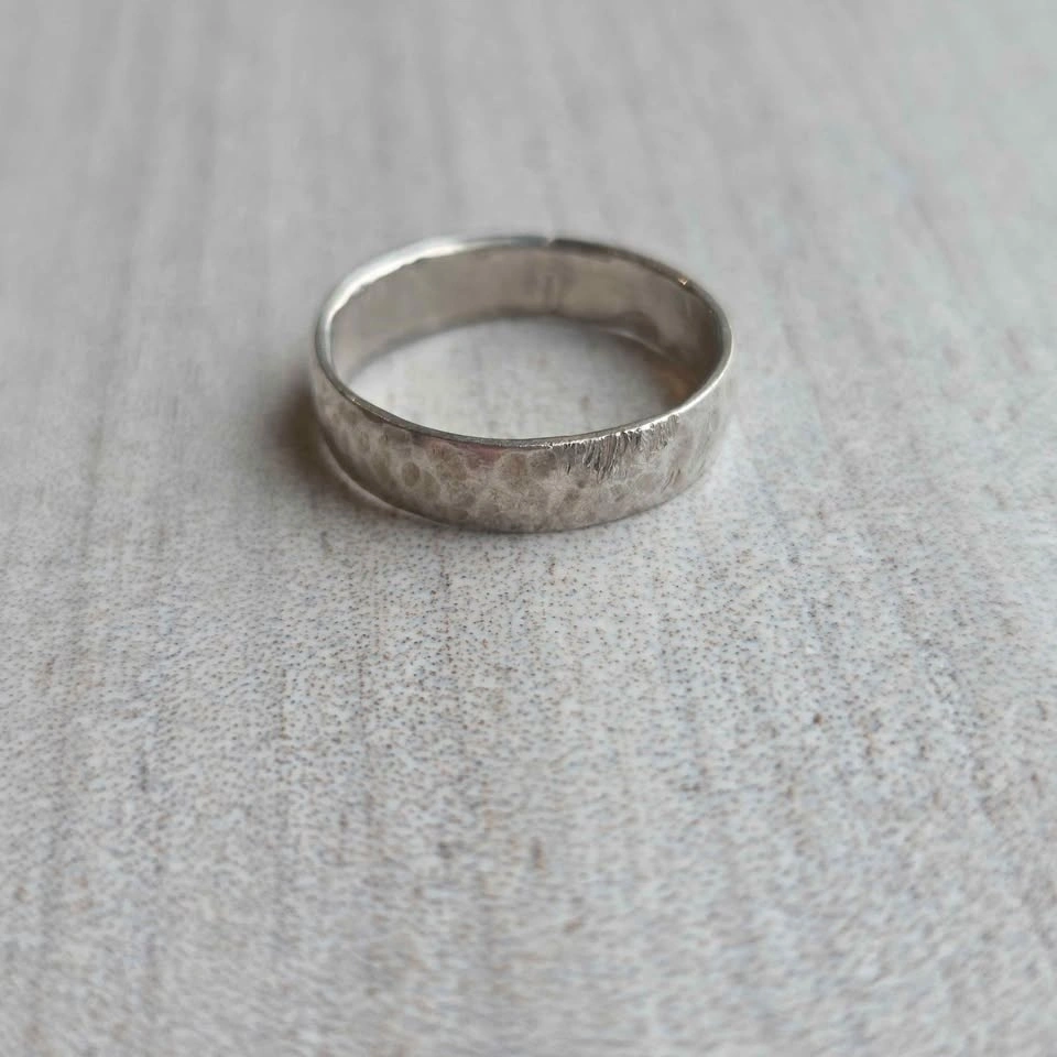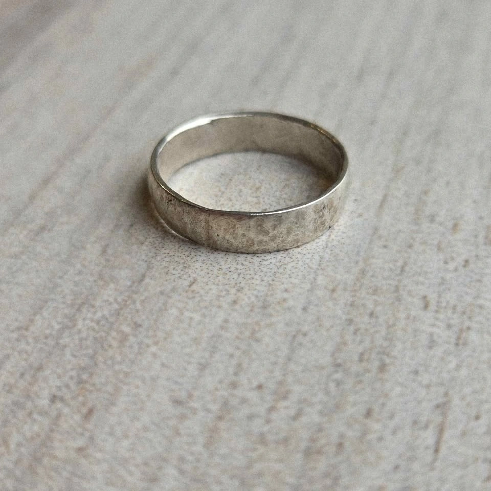 Sterling silver band ring with a light hammered texture. Size 5. Some signs of wear, visible in the photos. Great stocking stuffer! See my other adds. Lots of treasures to be found.