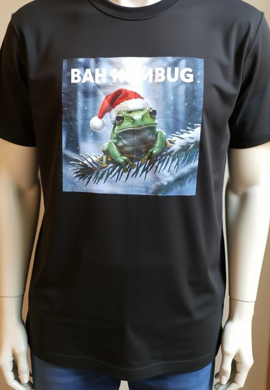 Check out this black t-shirt featuring a festive frog wearing a Santa hat and the words "Bah Humbug"! It's a fun and quirky design for the holidays