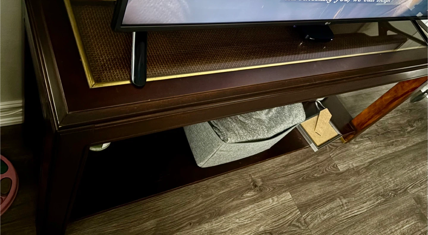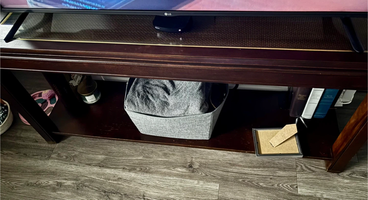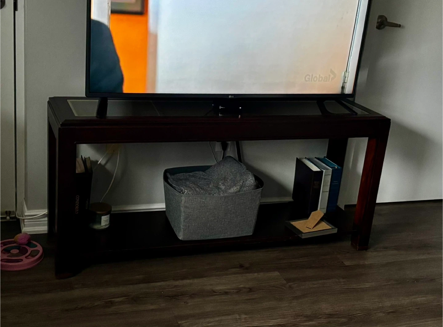 Selling a dark brown wood table forTV stand or hallway. Dimensions are 58”x15”x26”. It has a glass top and a shelf underneath for storage. Perfect for any living room!