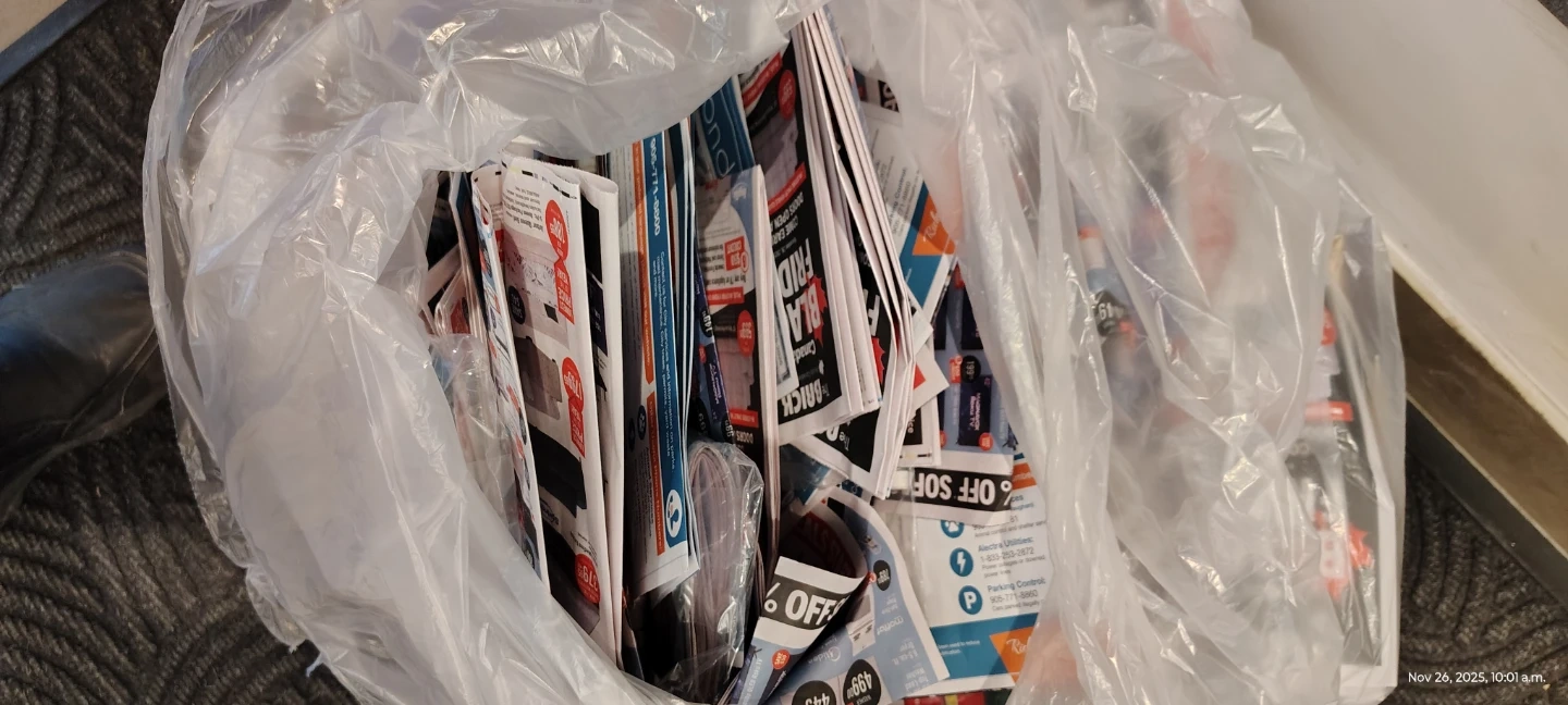 Large bags full of unused newspaper or flyers from local Richmond Hill news sources and/or retailers, Including grocery store outlets.