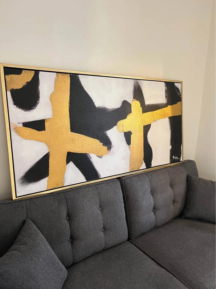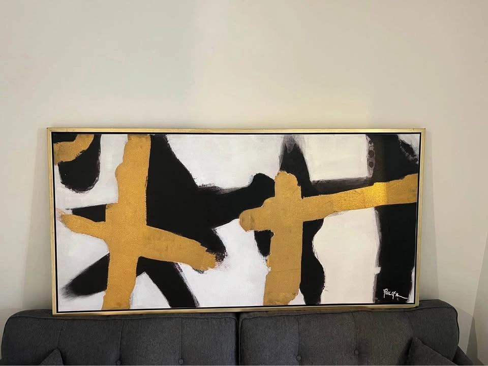 Beautiful abstract painting goes with any decor. 29.5” x 59”. Will fill your wall and add a pop of colour to your room. Has small chip in the frame barely noticeable.