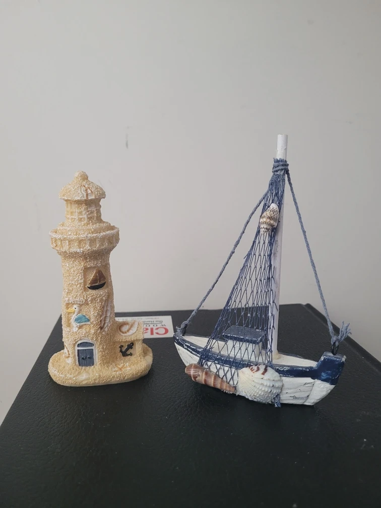 Cute nautical-themed figurines featuring a lighthouse and a sailboat! These would be perfect for adding a touch of seaside charm to any room