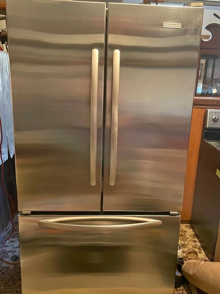 Selling a KitchenAid stainless steel refrigerator with French doors and a bottom freezer drawer. Runs perfectly and keeps food cold and fresh — no issues at all. Clean inside and out, ready for immediate use.