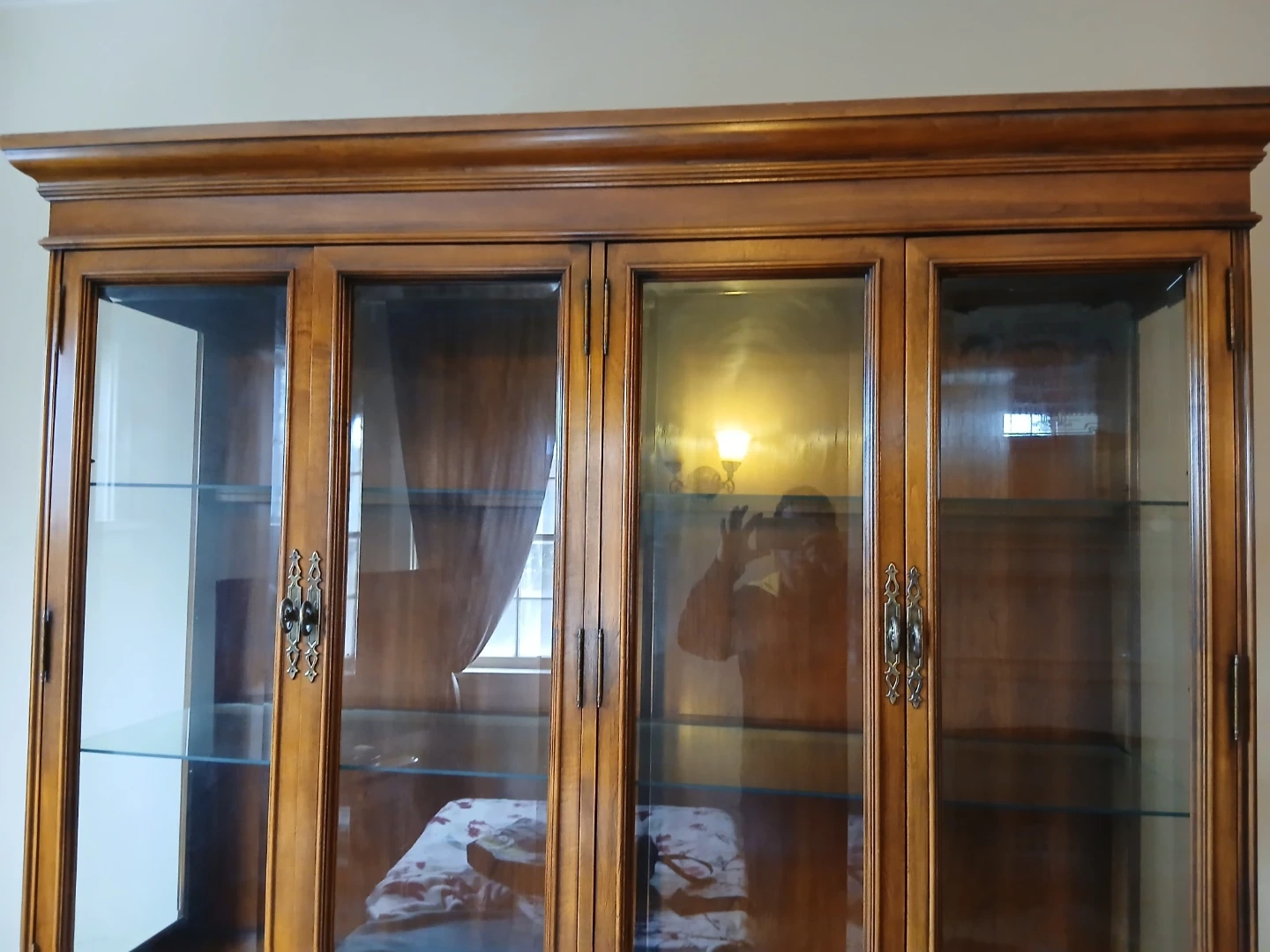 Selling a beautiful wooden china cabinet with glass shelves. It's perfect for displaying your favourite dishes or collectibles. The cabinet features a classic design with detailed handles and a warm wood finish. It has both upper glass cabinets and lower wooden cabinets for storage.