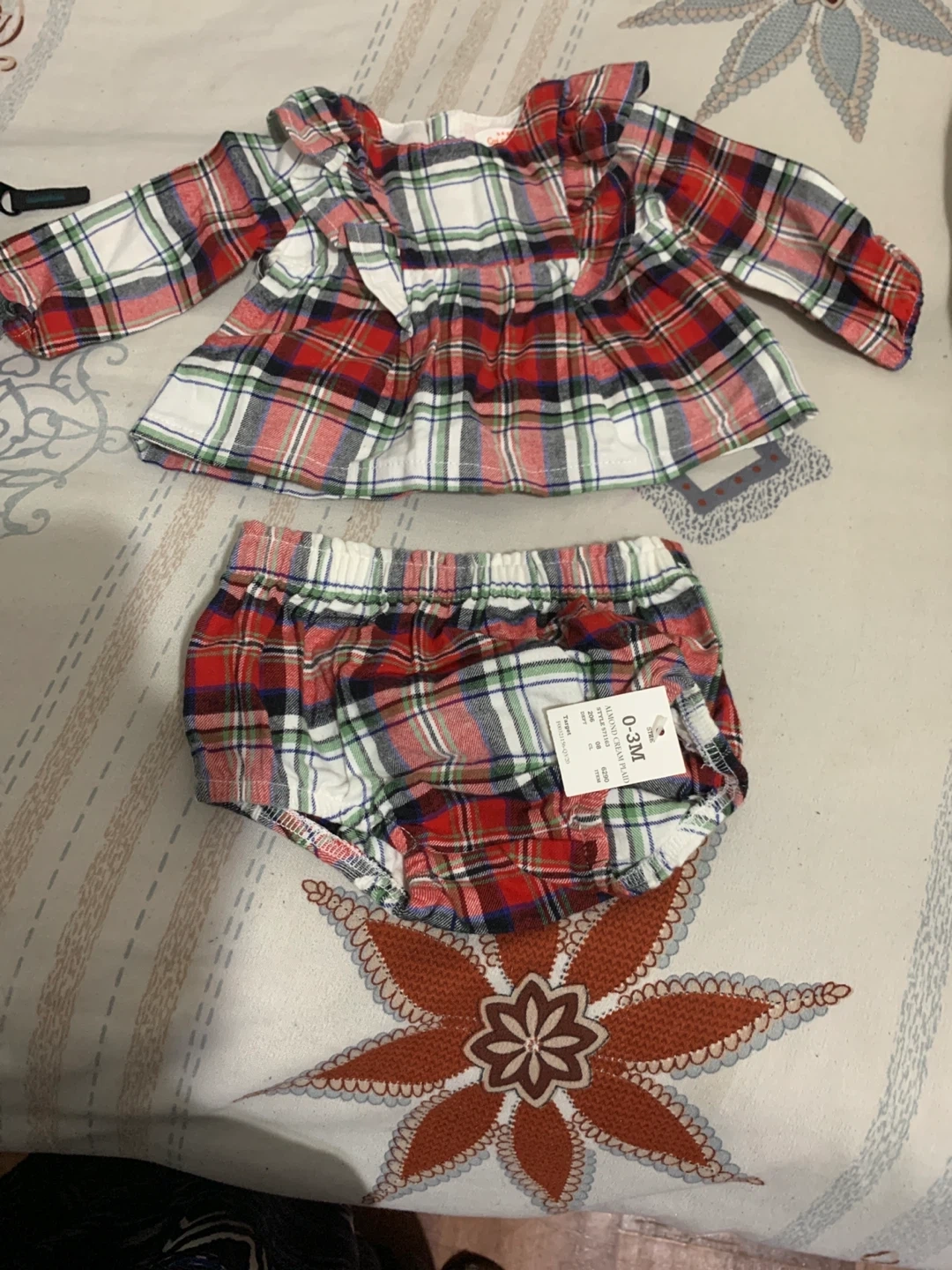 Cute Cat & Jack baby outfit in size 0-3 months! The set features an almond cream plaid pattern. Perfect for your little one!