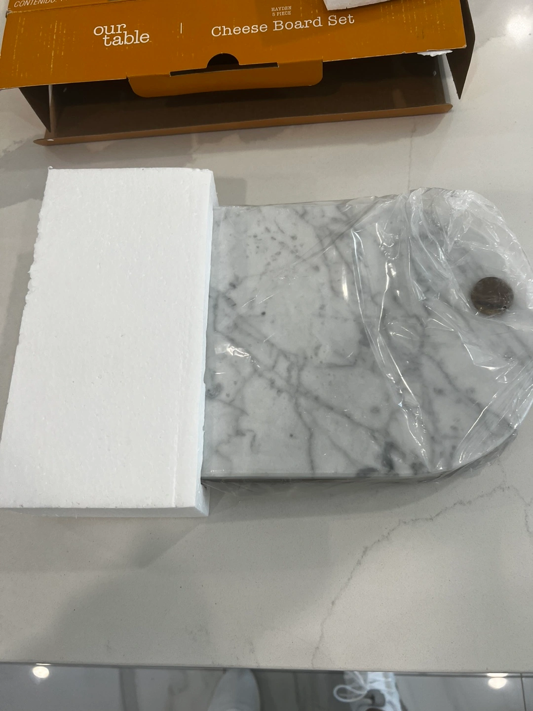 Selling an Our Table Hayden 5-piece cheese board set. It includes the marble board, wooden base, and four cheese knives.