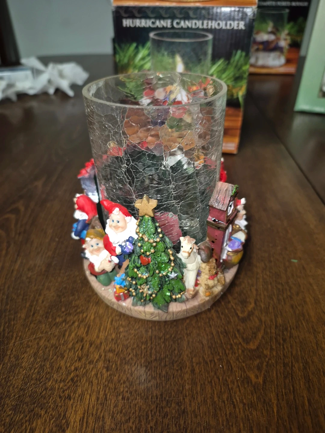 This is a hurricane candleholder decorated with Christmas themed figurines. It's in great condition and ready to add some festive cheer to your home! Ceramic with glass insert.