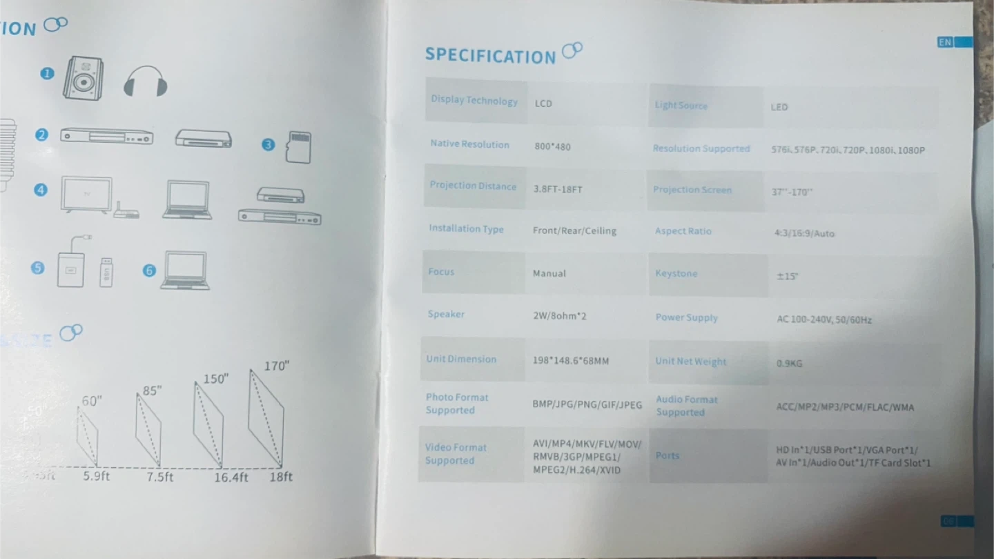 It also comes with a 1080P rear camera. The display technology is LCD, and the light source is LED. It supports various video and photo formats, and includes ports for HD IN*1/USB Port*1/NGA Port*1/AV IN*1/Audio Out*1/TF Card Slot*1